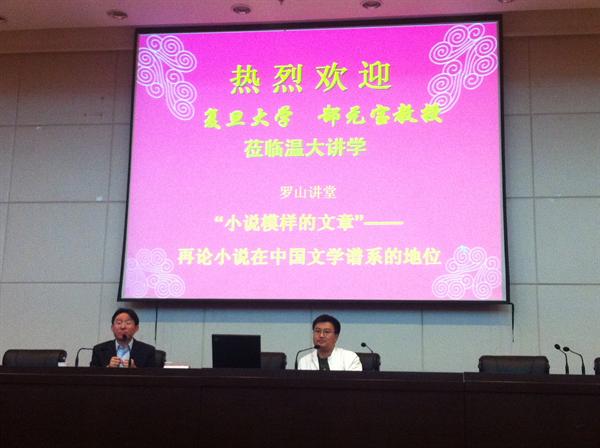 11月11日晚,2013年第24期罗山讲堂在bat365在线中国官网登录入口育英图书馆拉开盛幕,本次讲堂的主题为“小说模样的文章——论小说在中国文学谱系中的地位”。主讲为来自复旦大学的郜元宝教授。出席人员有学院党总支书记吴静、副院长孙良好、青年作家马小予、崔勇和陈小碧博士。