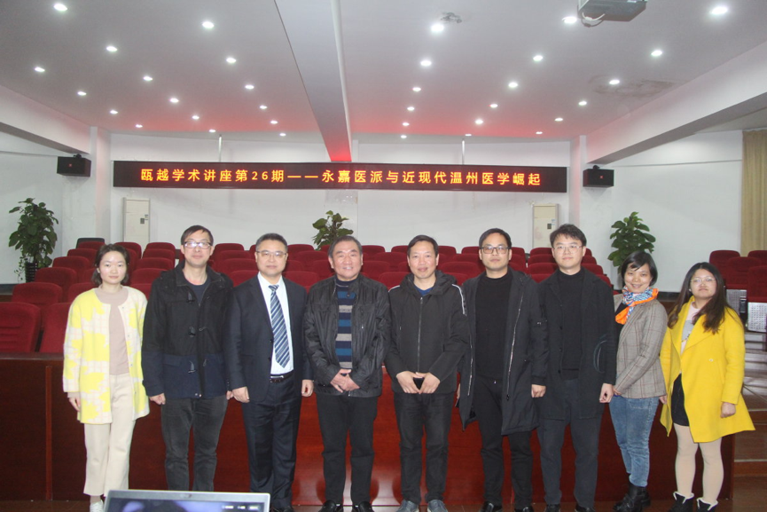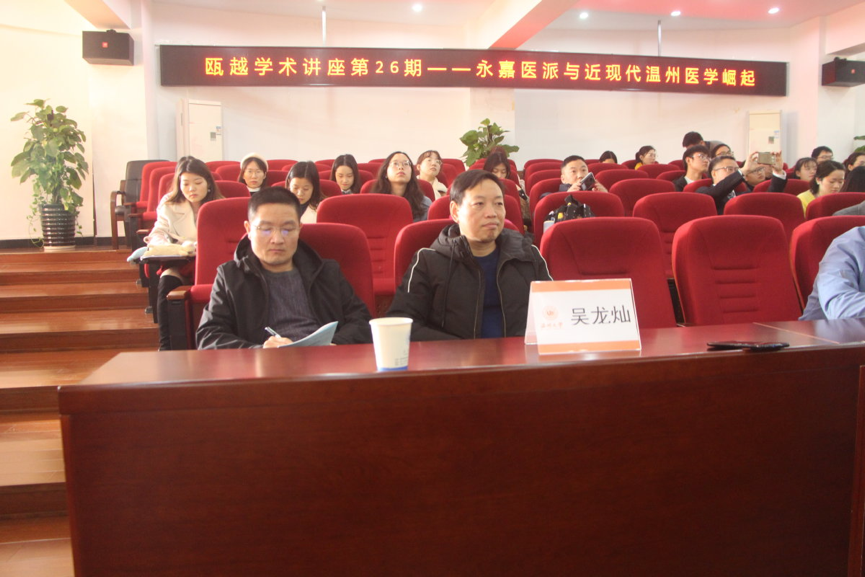 2019年12月4日下午14点30分,温州医科附属第二医院中医学教授、主任医师、温州市名中医、浙江省名中医、国家级名中医刘时觉教授在人文楼203报告厅举办了主题为“永嘉医派与近现代温州医学”的第28期瓯越学术讲座,参加此次讲座的有bat365官网王兴文、张洁、尤育号、夏诗荷等老师和中国史、古典文献学和古代文学专业的研究生同学,以及来自温州医科大学、温州市中医药文化学会专家学者和全市各地中医、文史界人士。讲座由吴龙灿老师主持。