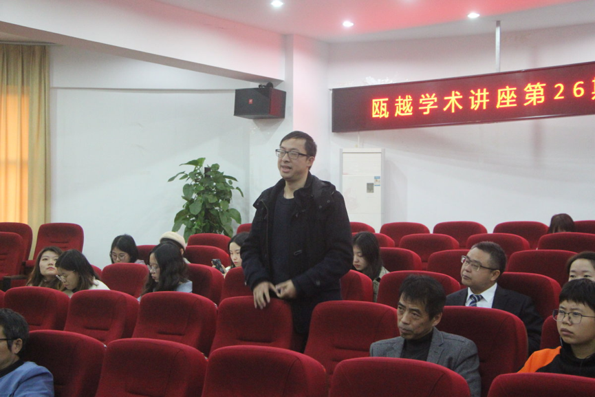 讲座演讲部分结束后,王兴文老师点评讲座内容,高度评价刘先生对永嘉医派、温州地方医学史、医学典籍研究等方面的卓越学术成就和本次讲座演讲的温州地方医学史精彩演绎,并结合自己的学术研究经历进行补充讲解温州地方历史文化研究的学术方法和广阔空间。随后的问答环节,观众们都十分活跃,他们争先恐后地向刘时觉教授提出问题:“如何看待元史、金史没有记载朱丹溪的现象”、“永嘉医派、永嘉学派和利济医派之间是否有联系”、“中医学院的教育学习”及“由博返约理念的运用”等问题,刘时觉教授认真予以详尽解答。讲座尾声,主持人吴龙灿老师进行了总结发言,认为医学不仅是一个行业和科技领域门类的事情,还是一个重要的学术研究视角,我们可以从医学角度来研究中国和地方政治、社会、文化等多方面发展特征。本场讲座内容丰赡,到场聆听学生收获颇多。