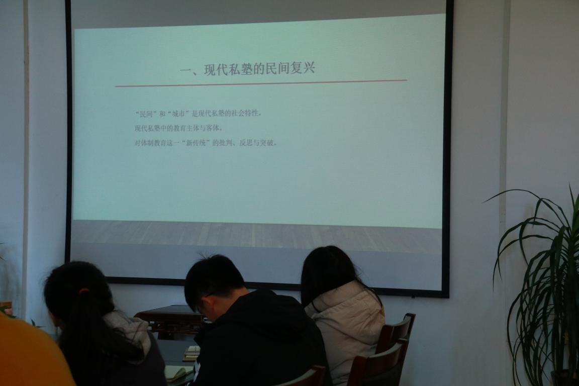 首先,陈映婕老师讲述了她研究现代私塾的原因,以加拿大华人开设专门教授经典的课外辅导班为例,认为国外华人诵读经典的做法与国内私塾教育的复兴有着千丝万缕的联系,并就此产生研究兴趣。她认为私塾作为中国古代重要的乡村基层教育机构,在现代以民间遗产的形式悄然复兴,拥有着与体制学校不同的教育理念和文化传承。并且,她谈到现代私塾的社会特性是“民间”和“城市”,参与私塾教育的主体存在多元化,认为现代私塾的复兴是对体制教育的批判、反思与突破。