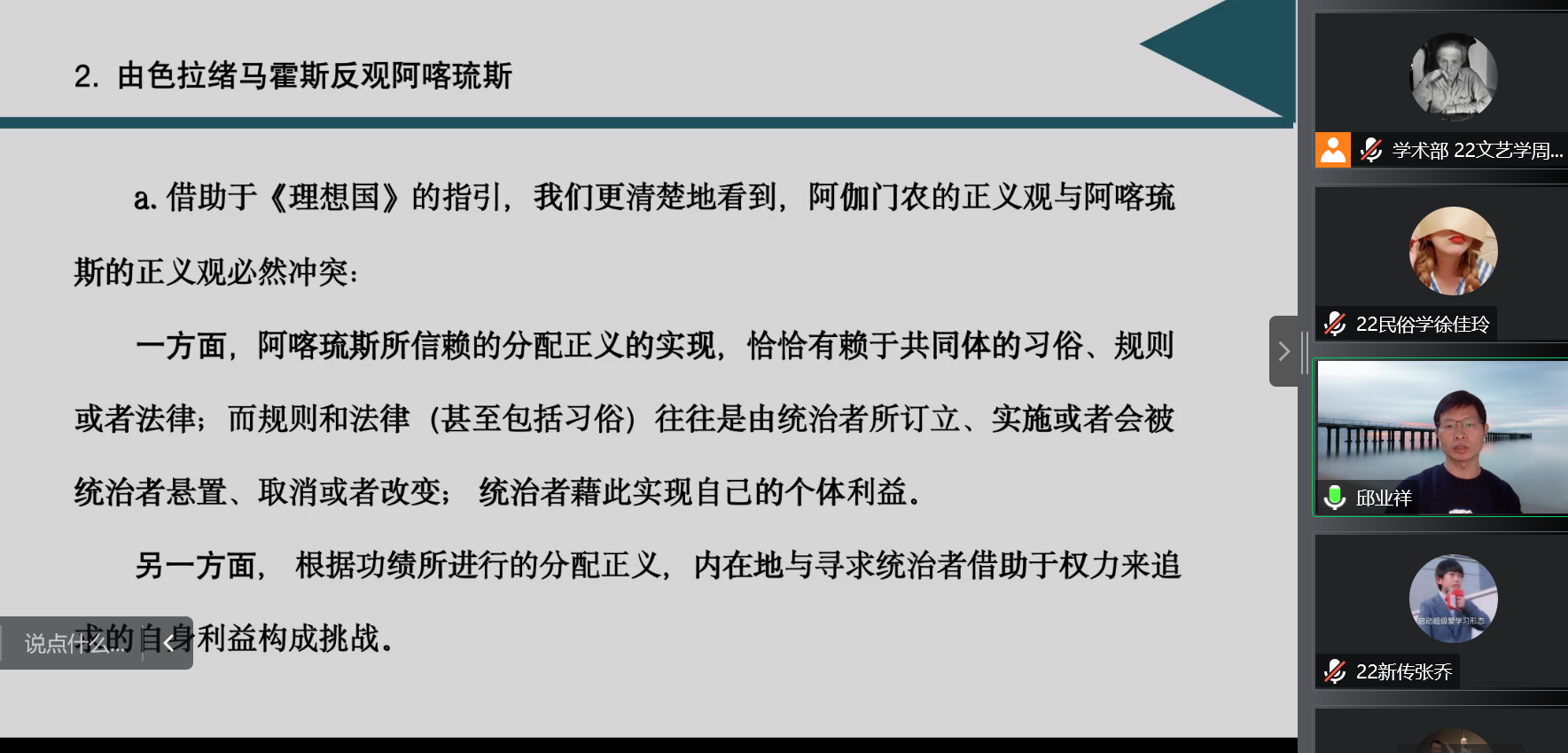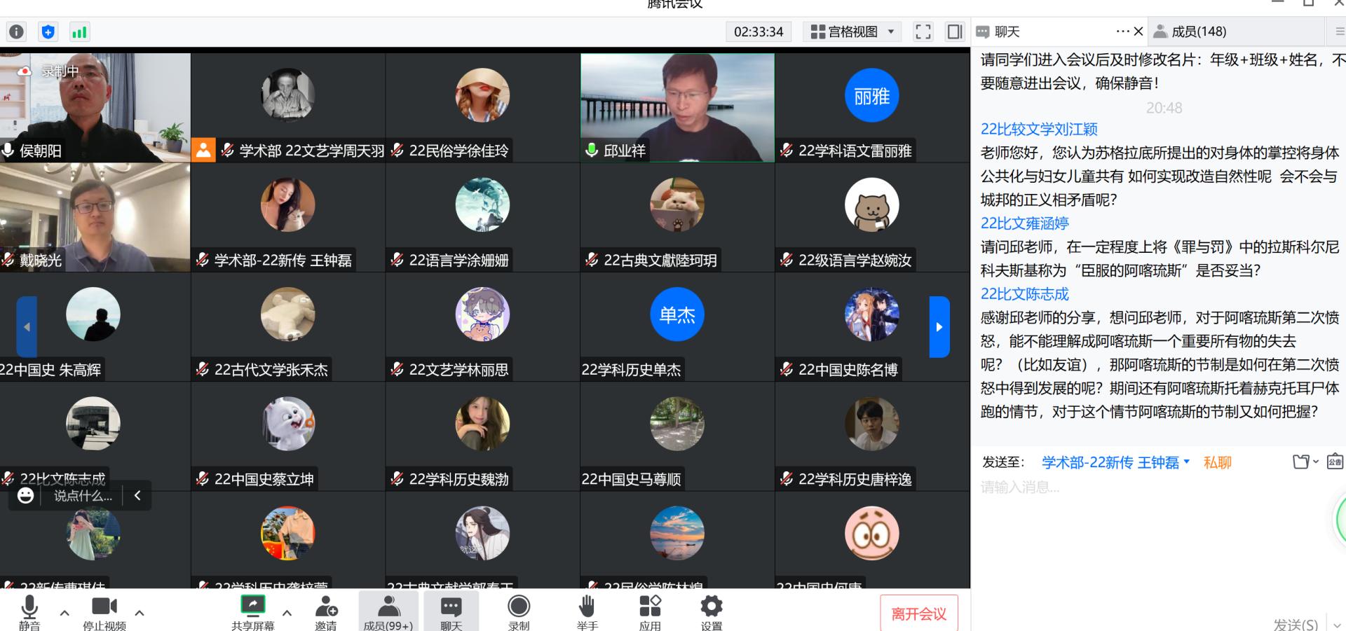 2022年11月4日19点,河南大学文学院教授、博士生导师邱业祥老师受邀为bat365官网师生带来了一场题为“苏格拉底论阿喀琉斯——以《理想国》为中心”的精彩讲座。讲座由侯朝阳老师主持,中国人民大学文学院青年教师戴晓光博士参与对谈。