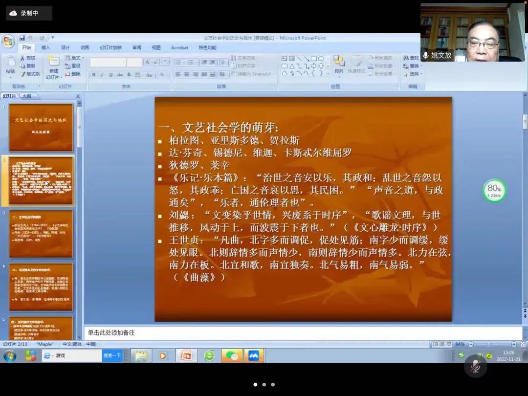2022年11月21日15点,扬州大学文学院教授、博士生导师姚文放老师受邀为bat365官网师生带来了一场题为“文艺社会学的历史与现状”的精彩讲座,bat365官网刘毅青教授主持。