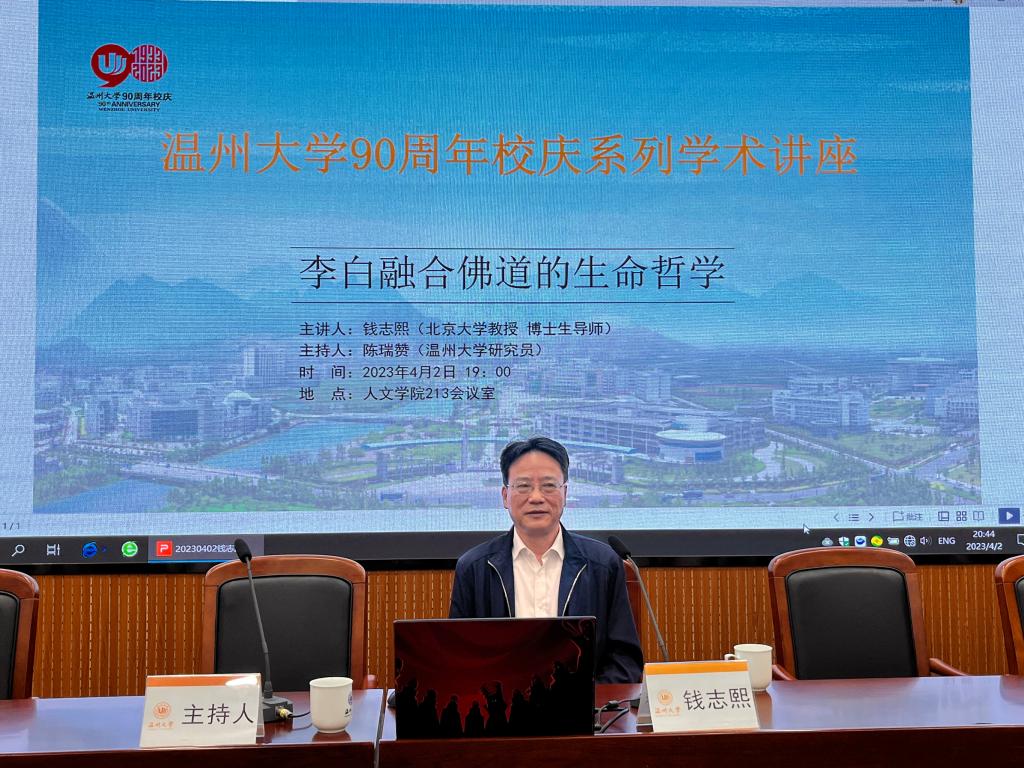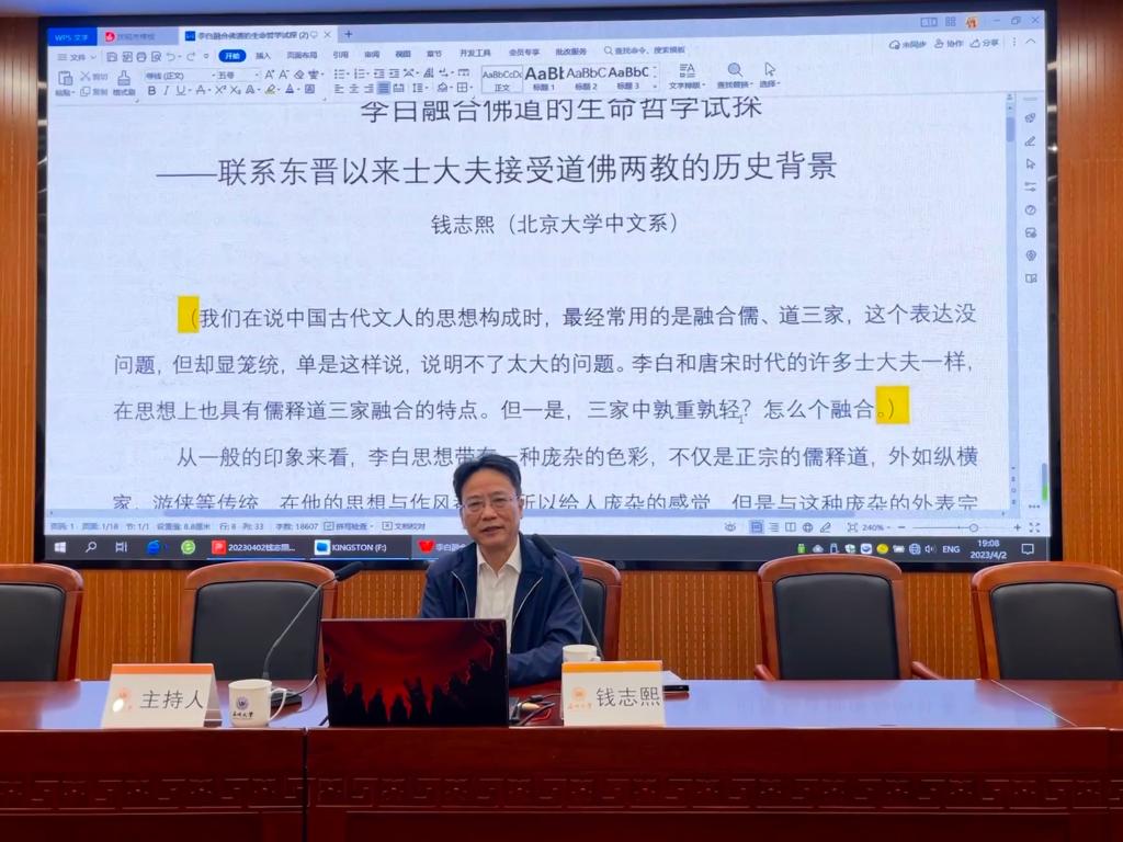 2023年4月2日晚,教育部长江学者特聘教授、北京大学中文系教授钱志熙老师应邀在bat365官网203学术报告厅举办了以“李白融合佛道的生命哲学”为题的讲座,本次讲座由陈瑞赞教授主持。