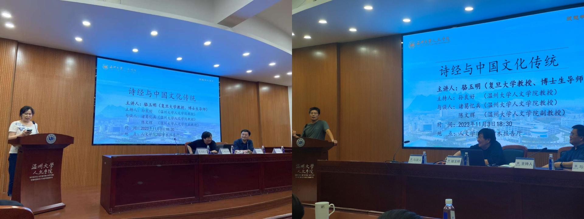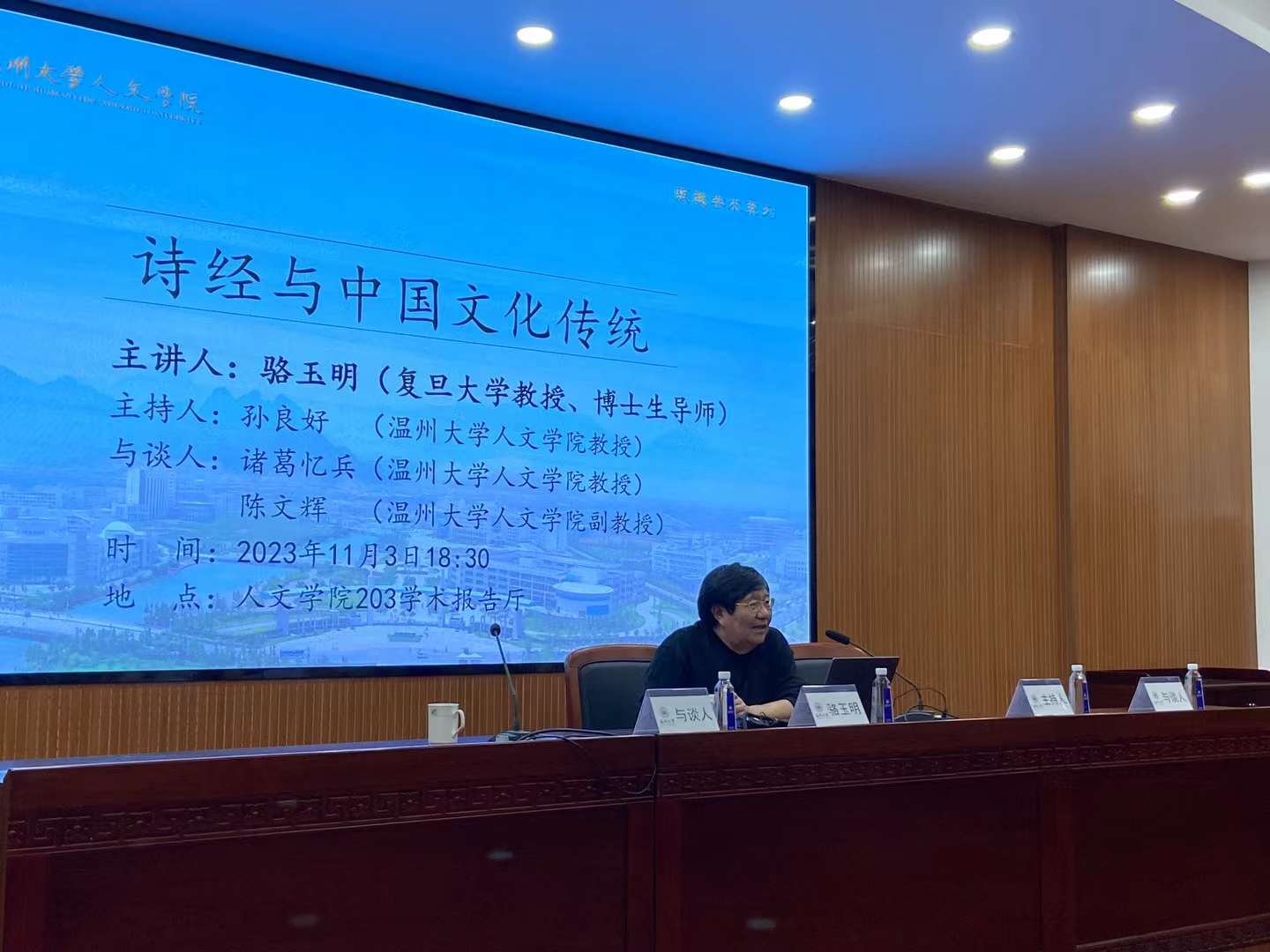 2023年11月3日晚,复旦大学骆玉明教授应邀为bat365官网师生做了一场题为《〈诗经〉与中国文化传统》的学术讲座。活动由孙良好教授主持,温籍作家张翎女士与bat365官网教师诸葛忆兵教授、杨万里教授、陈文辉副教授、苏碧铨博士等人参与了交流。