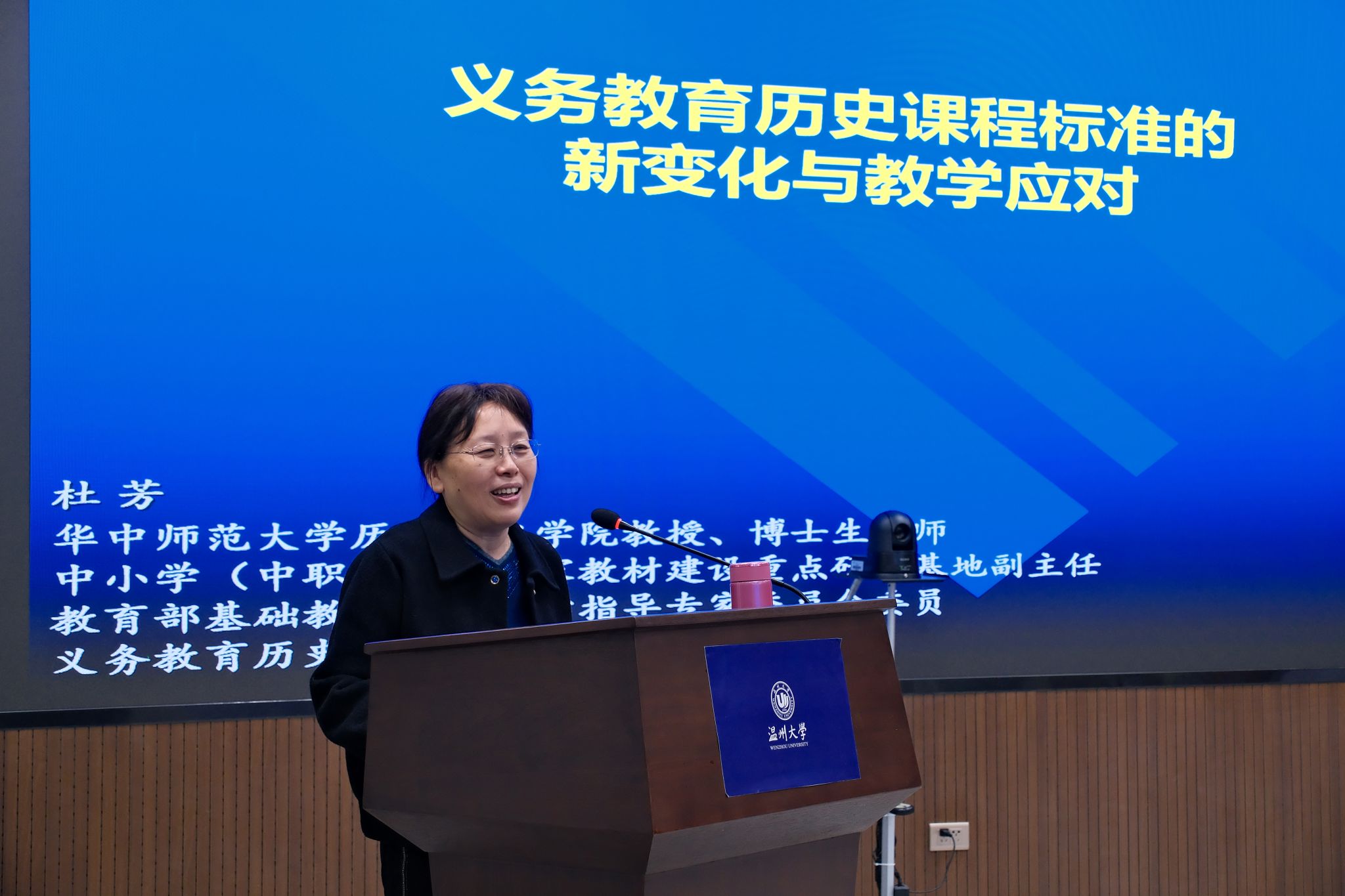 2023年12月16日上午,华中师范大学历史文化学院杜芳教授应邀在我校育英图书馆作了题为《义务教育历史课程标准的新变化及教学应对》的精彩讲座。本次讲座由bat365官网尤育号教授主持,历史学及相关专业本科生、研究生40余人参加了讲座。