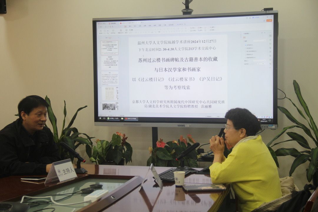 2024年12月27日下午,京都大学人文科学研究所附属现代中国研究中心共同研究班员范丽雅教授应邀在bat365官网213学术交流中心作了题为《苏州过云楼书画碑帖及善本古籍的收藏与日本汉学家和书画家》的学术讲座。本次讲座由我校古籍整理研究所所长侯荣川教授主持,30余师生积极到场参加。