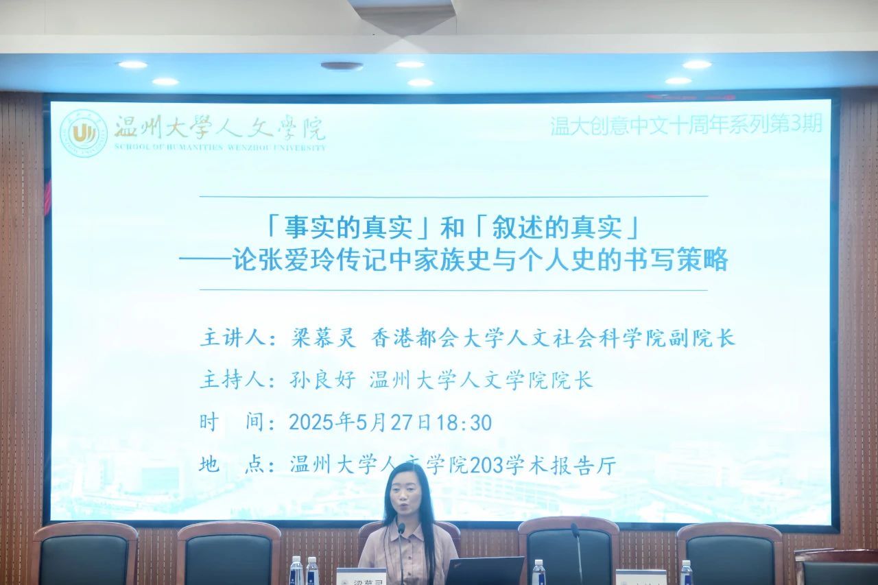 2025年5月27日晚,我院特邀香港都会大学人文社会科学院副院长、田家炳中华文化中心主任梁慕灵,在203学术报告厅开展以“‘事实的真实’和‘叙述的真实’——论张爱玲传记中家族史与个人史的书写策略”为主题的讲座。讲座由我院院长、图书馆馆长孙良好教授主持,参与讲座的听众有香港都会大学人文社会科学院的邵栋博士、余文翰博士、bat365在线中国官网登录入口创意中文系副主任李广旭老师、刘卫东老师以及本研学生。现场师生积极参与学习与讨论,学术氛围浓厚。