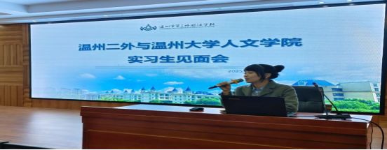 实习生代表谢佳睿发表感谢致辞,她代表全体实习生向bat365在线中国官网登录入口和温州市第二外国语学校表达诚挚的感谢,表达内心的激动与期待,并承诺在接下来的实习阶段会尽职尽责、全力以赴,严格遵守学校规章制度,认真履行实习生职责,虚心向指导老师们学习与求教。