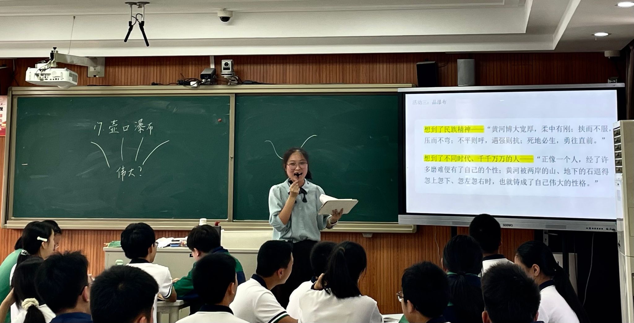 刘昱彤同学聚焦文本语言赏析,引导学生品味“碎成点,碎成雾”“钻石觅缝,汩汩如泉”等句子的精妙。她结合“助读材料”解读梁衡散文的语言风格,带领学生从“水的形态”延伸至“黄河的性格”,进而感悟文中蕴含的“百折不挠、坚韧顽强”的民族精神,实现了从“语言美”到“精神美”的认知升华。