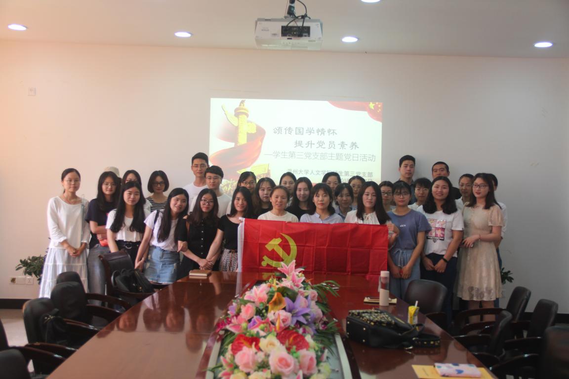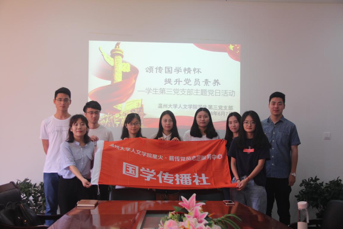 2018年6月7日上午,bat365官网学生第三党支部携手国学传播社在人文楼213会议室成功开展了“颂传国学经典 提升党性修养”主题党日活动。本次活动由学生第三党支部书记徐珍组织安排,学生第三党支部全体学生党员共同参与其中,并作了分享交流。