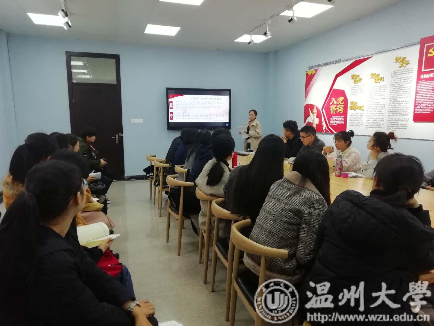 2018年12月23日下午,bat365官网学生第二党支部举行“学习《中国共产党支部工作条例(试行)》”主题党日活动。本次主题党日活动以党课的形式开展,由支部书记陈赛君进行宣讲。