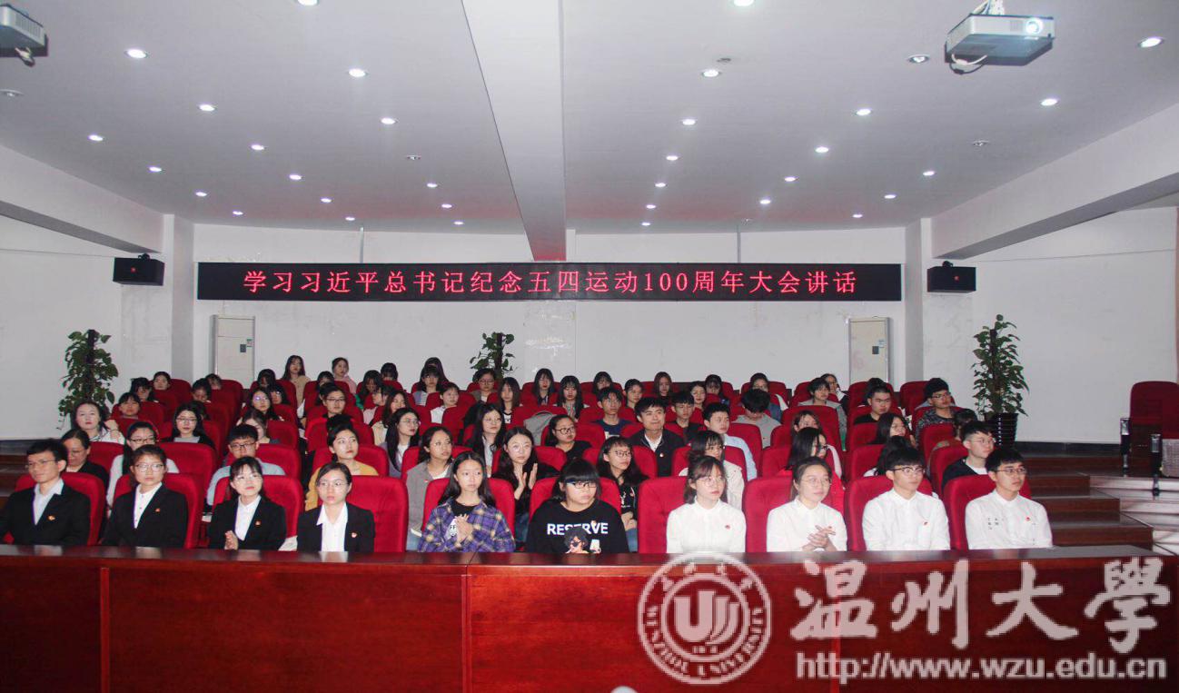 活动伊始,全体起立,奏唱共青团团歌。在激情洋溢的团歌之后,党员代表李林军从自身如何从一名团员成长为党员的历程进行发言。在全体人员重温入团誓词与入党誓词后,集体观看纪念五四运动100周年大会,一起感受那历久弥新的五四精神。会上,习近平总书记对广大青年寄予厚望,他说:“新时代中国青年要继续发扬五四精神,以实现中华民族伟大复兴为己任,不辜负党的期望、人民期待、民族重托,不辜负我们这个伟大时代。”
