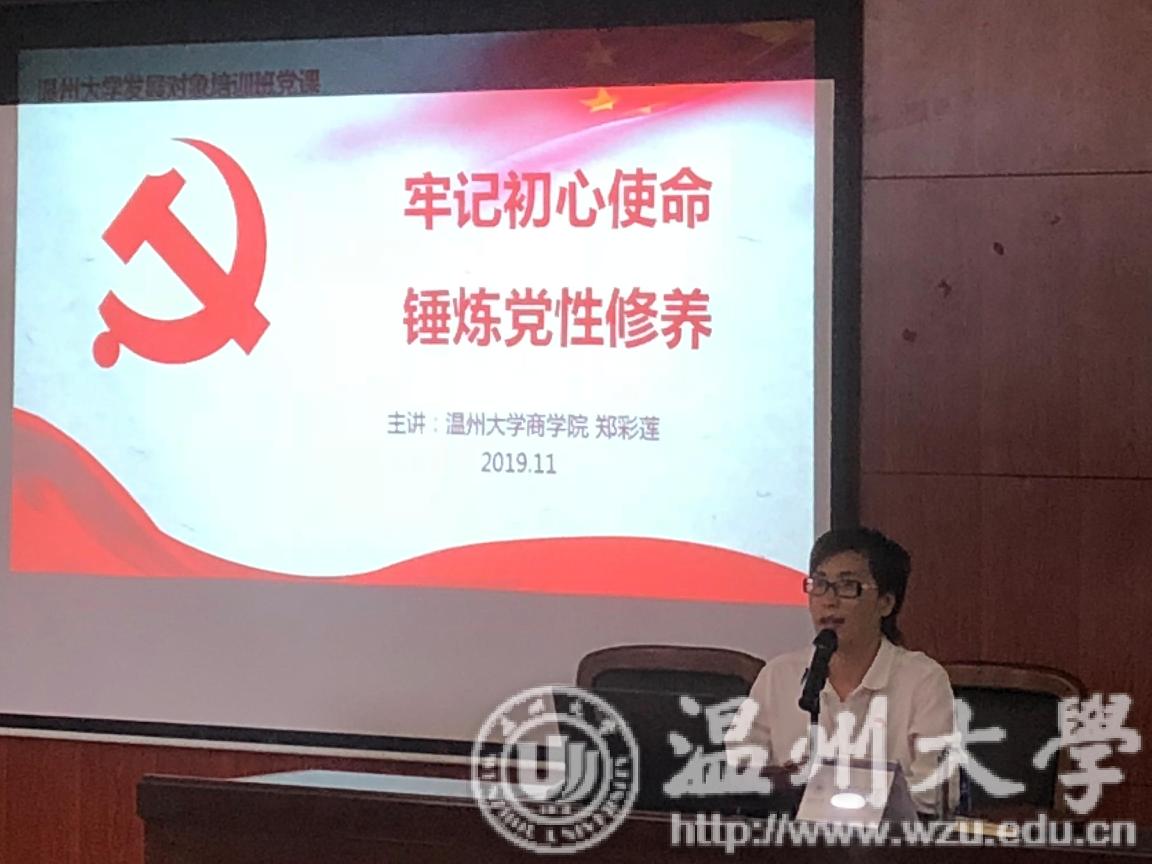 开班典礼结束后,由商学院党委书记郑彩莲老师为发展对象带来专题讲座——《牢记初心使命,锤炼党性修养》。郑老师首先就党性修养的本质属性进行了深入的解读,她表明党性修养是党员自我教育、自我改造、自我完善的过程,是党的本质属性在党员身上的内化。接着,郑老师强调了学生党员加强自身修养的重要性。她强调加强自身修养是共产党员个人健康成长的基本规律,是实施领导行为的必然选择,是事业不断发展的迫切需要,也是永葆我党先进性的内在要求。锤炼党性修养的密码就在于思想入党,同时要端正入党动机,并且在实践中修好共产党人的“心学”。最后,郑老师告诫我们:党性修养,要知行合一。路虽远,行将必致;事虽难,作则必成。