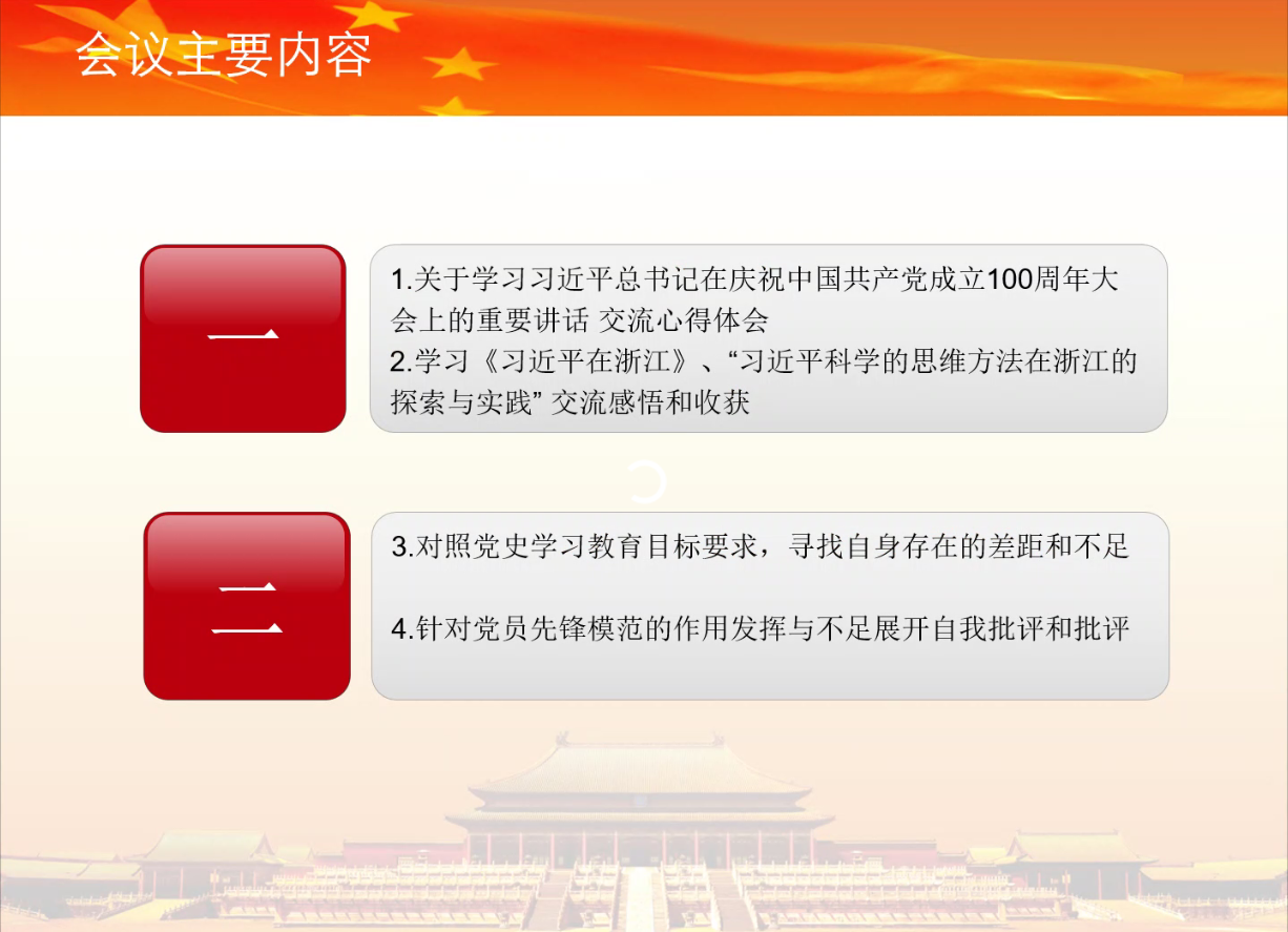 在防控疫情的特殊时期里,本次组织生活会以党史学习教育为专题,组织各位同志结合《习近平总书记在庆祝中国共产党成立100周年大会上的重要讲话》与《习近平在浙江》系列文章进行学习和交流心得,同时每位同志也结合具体学习内容,参照党史学习教育目标要求与党员先锋模范的作用发挥方面找寻自身存在的不足和差距。支部同志们在本次心得汇报中准备充分,在发言中能够体现出深刻的体会与感想。同志们在《习近平总书记在庆祝中国共产党成立100周年大会上的重要讲话》的学习中,集中表达了对祖国繁荣昌盛的喜悦,与作为共产党人,与党中央保持高度一致,继续践行为人民谋幸福、为民族谋复兴的伟大使命。同志们在对《习近平在浙江》系列文章进行充分学习后,结合我校地处浙江的现实进行思考,对“八八战略”与习近平总书记在浙江的科学思维方法进行了充分理解。