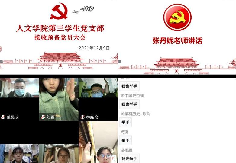 2021年12月9日,bat365在线中国官网登录入口学生第三党支部于线上开展了发展对象转预备党员的支部大会。由于新冠疫情影响,本次会议以线上方式进行。会议由支部书记李扬帆主持,支部指导老师张丹妮、支部全体党员参加了此次大会。