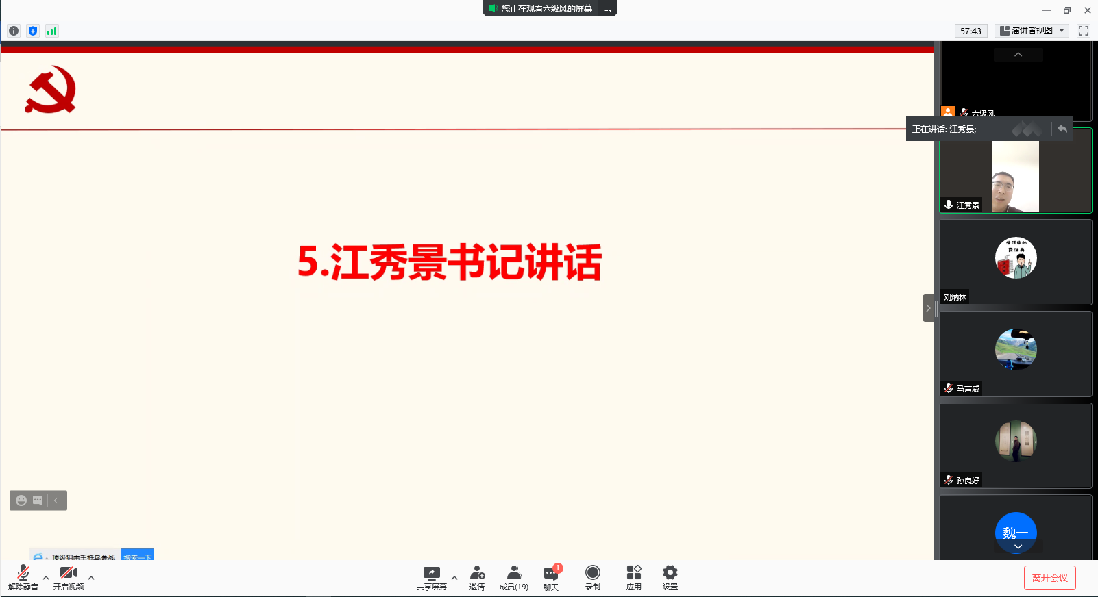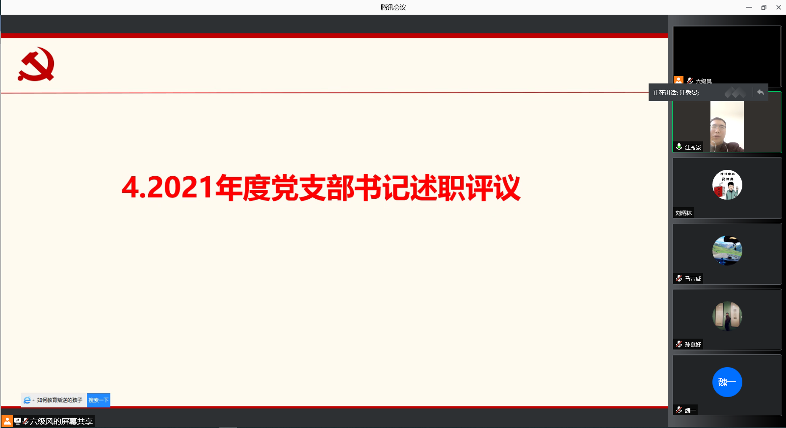 在听取了各党支部书记2021年度述职汇报后,江秀景作总结讲话。他充分肯定了各支部一年来在政治引领、组织建设、活动开展上取得的成绩,鼓励各支部书记进一步围绕学院中心工作和党建工作重点,强化书记党建第一责任人意识,履职尽责、奋力拼搏。他指出,今年正值党的二十大召开之年,同时也是习近平总书记提出办好bat365在线中国官网登录入口殷殷嘱托20周年,希望各支部能够在保持现有成果的基础上重点做好以下几方面工作:一是理论学习要常抓不懈。做好学习贯彻党的二十大精神系列活动,高标准落实“双周三下午教师理论学习制度”。二是组织建设要持续深化。要在支部标准化、规范化上下功夫,做实党支部书记述职评议、支部达标验收、党员发展档案自查等工作。三是支部品牌要总结凝练。立足好传统、好项目,聚焦“双创”工作,按照“一支部一品牌、一支部一特色”要求,深化支部品牌创建。四是引领发展要有机融入。要切实按照《中国共产党普通高等学校基层组织工作条例》规定的教工党支部、学生党支部的工作职责,围绕学院中心工作、围绕师生所需所盼,有效组织和开展支部各项工作,形成党建工作和治理结构的有机融合。