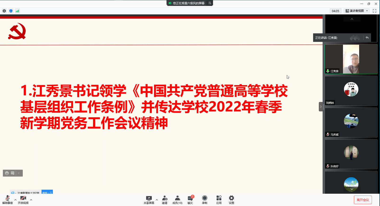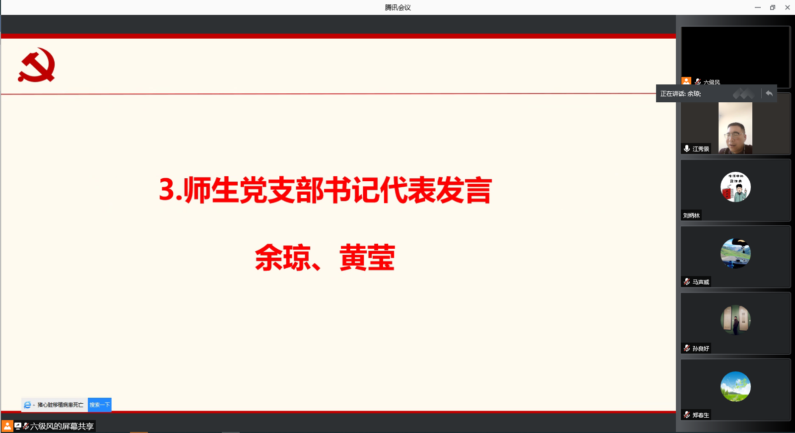 会上,院党委书记江秀景传达了学校基层党建工作会议暨2022年春季新学期党务工作会议精神,并领学了《中国共产党普通高等学校基层组织工作条例》。教工第三党支部书记余琼老师、学生第一党支部书记黄莹同学做支部工作典型发言。
