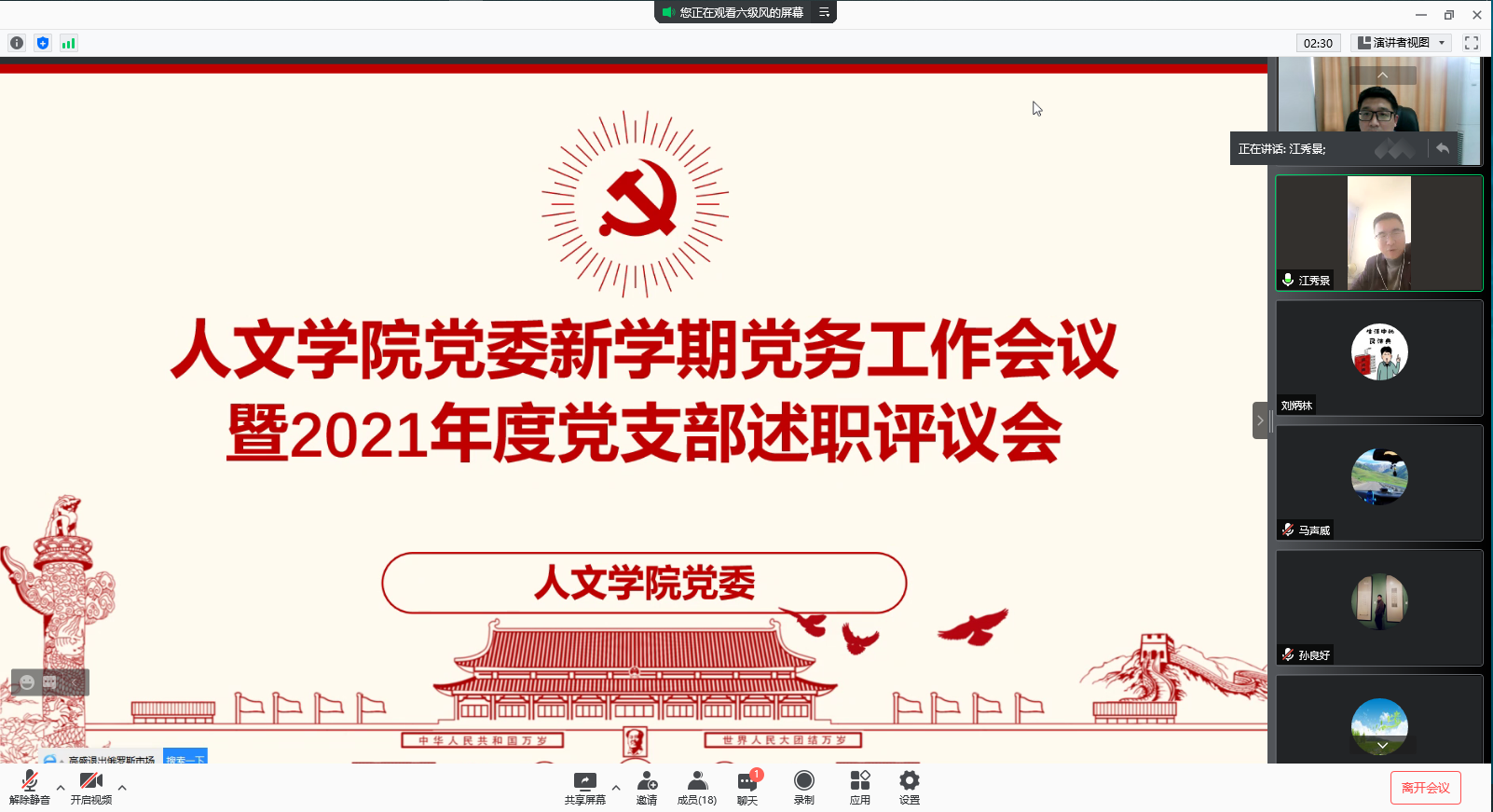 3月11日下午,bat365官网召开新学期党务工作会议暨2021年度党支部书记述职评议会。院党委全体委员、各师生党支部书记参加。院党委书记江秀景主持会议。
