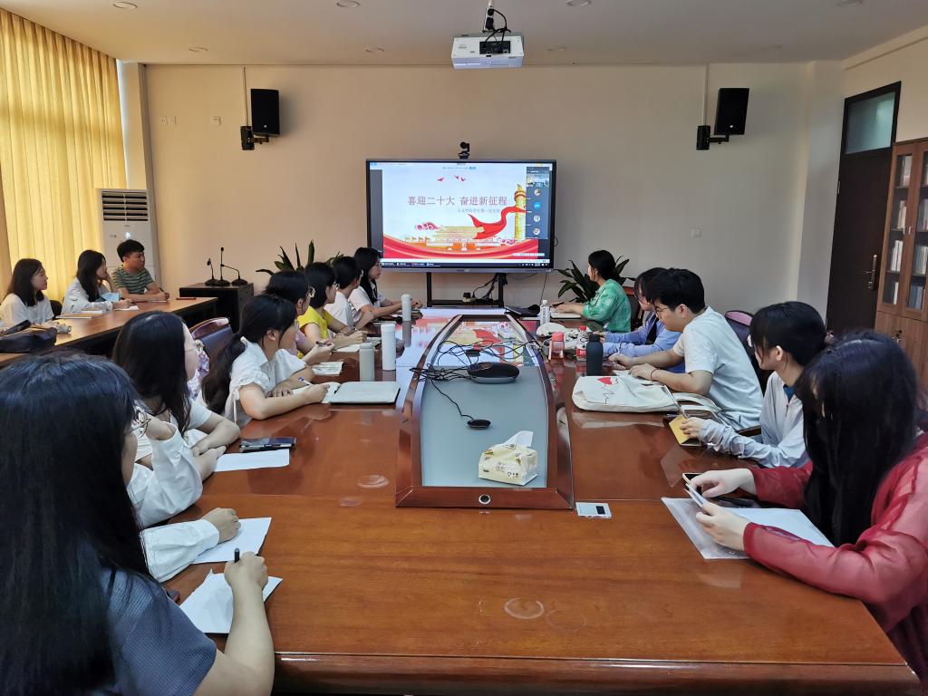 2022年9月16日,bat365官网学生第一党支部以线上线下相结合的方式,在人文楼213会议室召开了“喜迎二十大,奋进新征程”主题党日活动。本次党日活动由学生第一党支部书记黄莹主持。