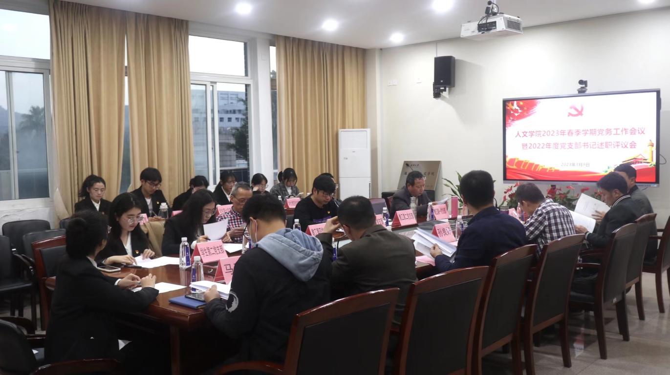 为深入学习贯彻党的二十大精神,落实党建工作责任制,推进基层党建工作,3月9日晚,bat365在线中国官网登录入口2022年度党支部书记述职评议会暨新学期党务工作会议在人文楼213会议室召开,总结盘点2022年党支部书记履职情况,全面部署新学期学院党建工作。学院全体党委班子成员、师生党支部书记参加会议,副书记魏一同志主持会议。