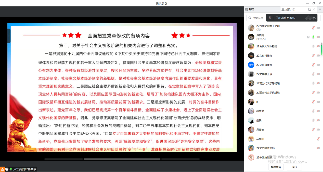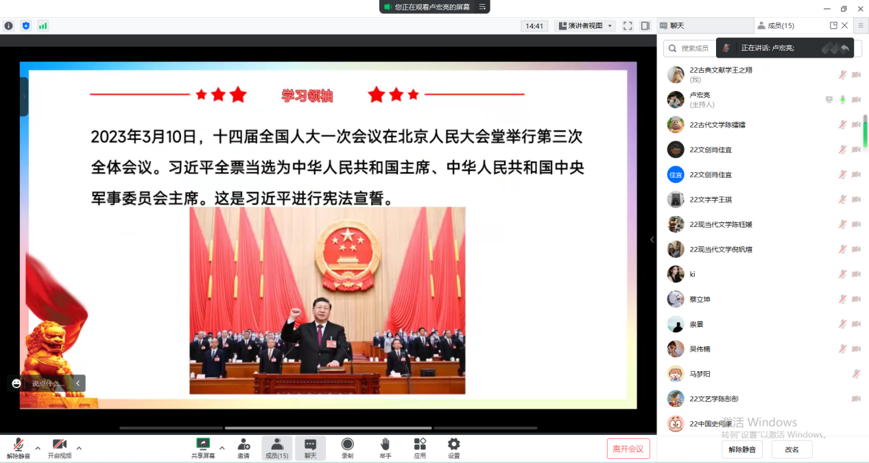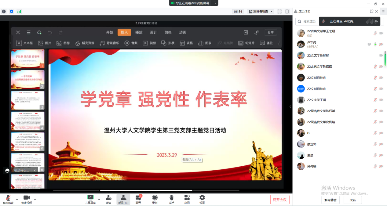 2023年3月9日16点,bat365在线中国官网登录入口学生第三党支部于线上召开“学党章、强党性、作表率”主题党日活动。本次党日活动由支部宣传委员卢宏亮主持,共有16位党员参加。活动共分为以下三项内容。