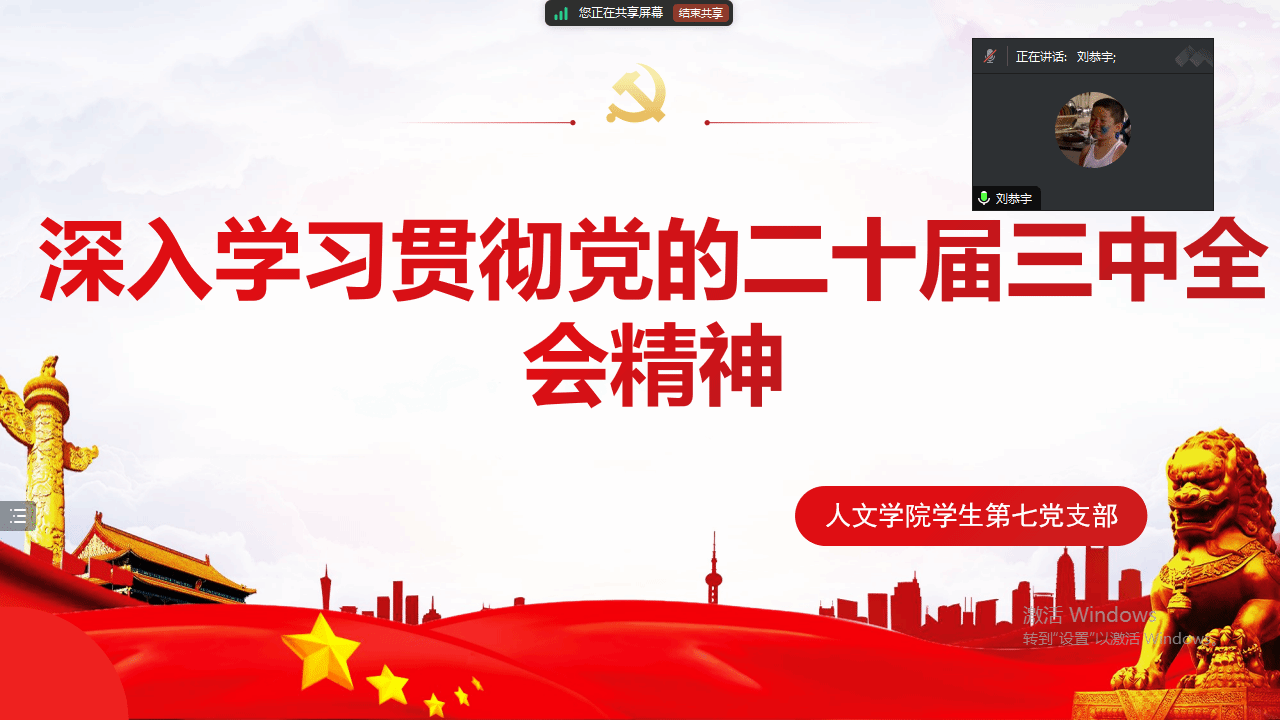 中国共产党第二十届中央委员会第三次全体会议(以下简称为党的二十届三中全会)于2024年7月15日至18日在北京召开。为深入学习贯彻此次全会精神,2024年8月6日晚,bat365官网学生第七党支部在线上开展了以“深入学习贯彻党的二十届三中全会精神”为主题的党日活动。会议由党支部书记刘恭宇老师主持。