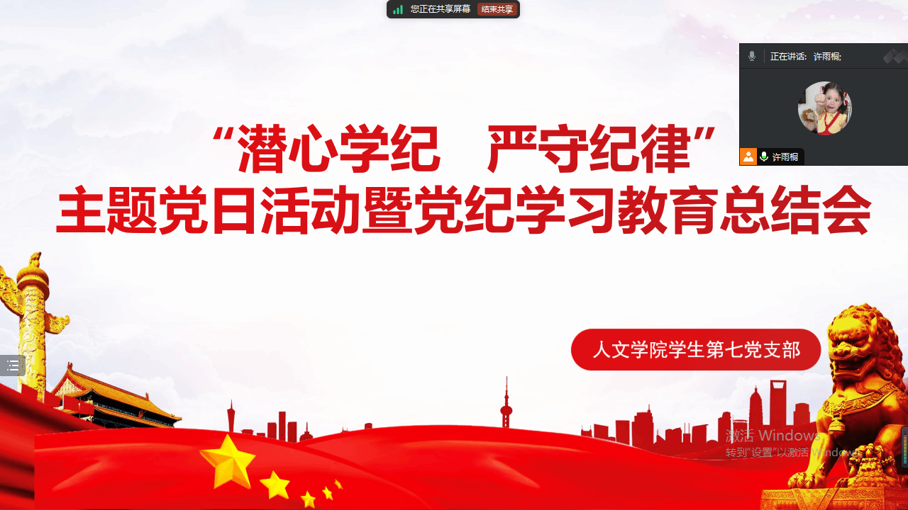 为深化“循迹溯源学思想促践行”行动,深入学习习近平总书记关于党纪学习教育的重要讲话和重要指示精神,推进党纪学习教育走深走实,取得实实在在的成效,2024年9月11日晚,bat365官网学生第七党支部在线上开展了以“潜心学纪 严守纪律”为主题的党日活动。会议由支部宣传委员许雨桐主持。