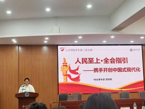 为充分发挥党员的先锋模范作用,传递党的二十届三中全会精神,11月2日下午,2024-2025学年bat365在线中国官网登录入口第二期团干培训在人文楼203学术报告厅举行,bat365官网学生第三党支部林桐安同志在会上做了题为《人民至上·全会指引——携手开创中国式现代化》的“四史”青年说宣讲。