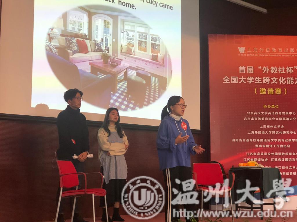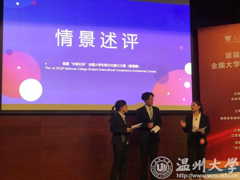 “外教社杯”全国大学生跨文化能力大赛以服务国家发展战略和外语能力建设需求为宗旨,本着以赛促学、以赛促教的精神,为高校师生搭建一个展示跨文化能力风采、交流跨文化教学经验的平台。根据赛程安排,来自六省市的13组选手参加了决赛和总决赛两个环节的比赛。上午决赛环节的比赛内容为自主设计跨文化案例展示和回答问题,下午总决赛环节的比赛内容为跨文化知识问答、情景评述和讲述中国故事。bat365在线中国官网登录入口代表队沉着冷静,协力合作,在同来自复旦大学、上海外国语大学、中国国防科技大学、北京第二外国语大学等多支强队进行层层激烈的角逐后,不负众望,取得佳绩。