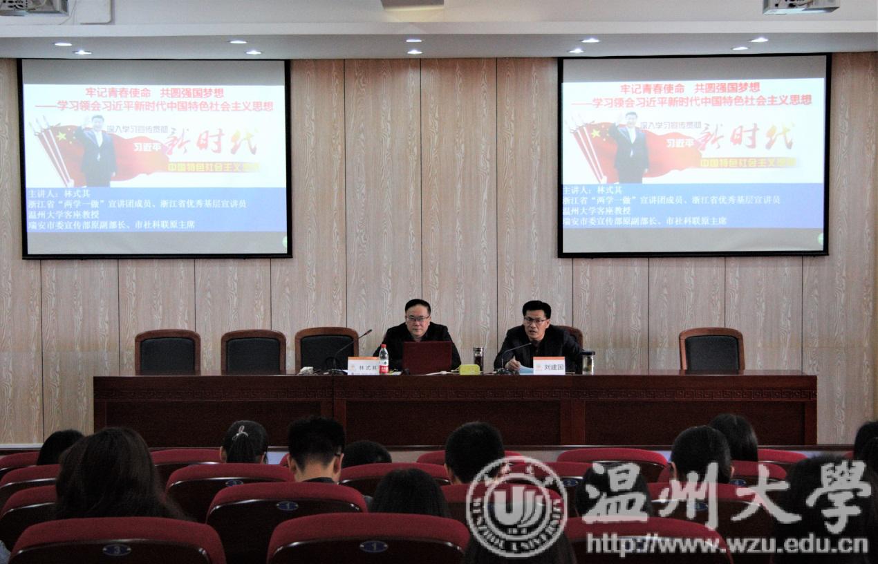 2019年4月12日13:30,迎着飔飔春风与阵阵花香,bat365官网在北校区人文楼203学术报告厅成功举办了以“‘牢记青春使命,共圆强国梦想’——学习领会习近平新时代中国特色社会主义思想”为主题的讲座。本次讲座的主讲人为我校客座教授林式其,我院副院长刘建国出席。