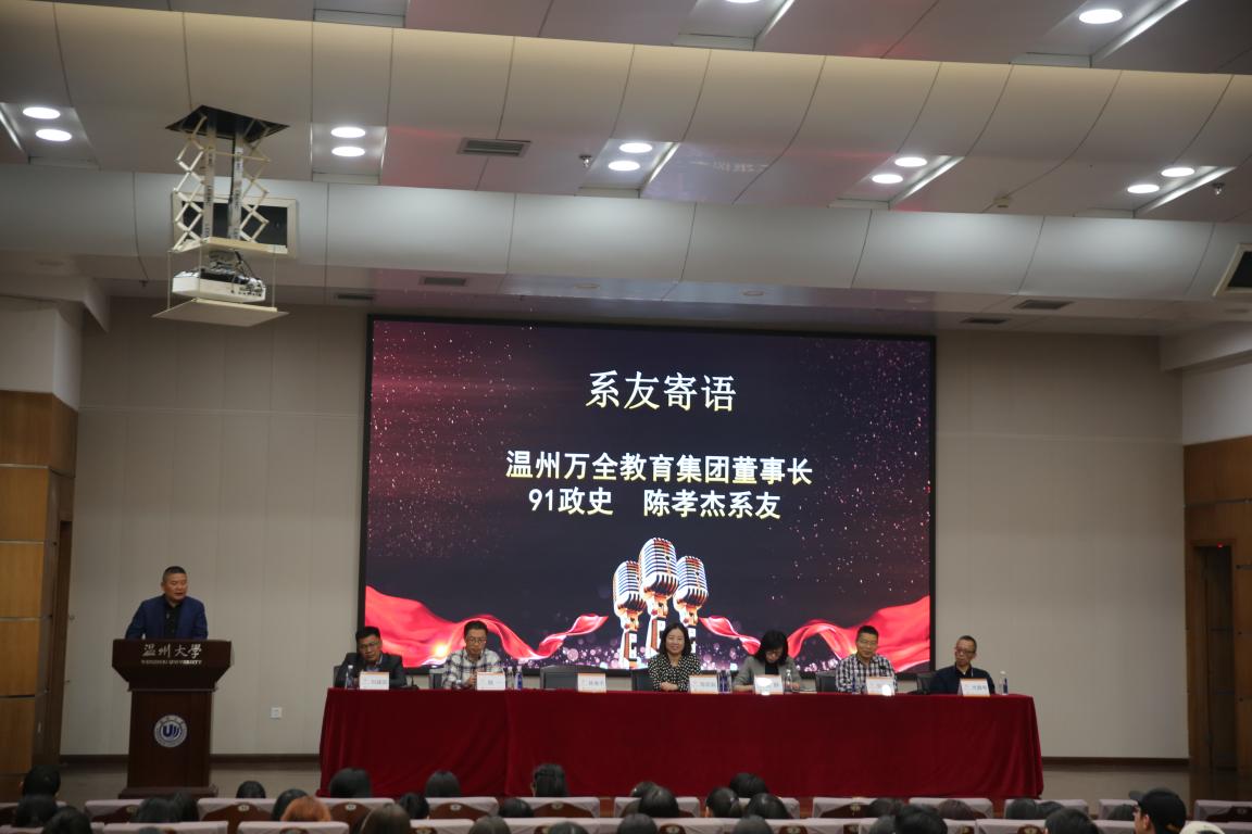 2020年11月14日,经前期协调沟通,温州万全教育集团为bat365在线中国官网登录入口捐资设立的“瑞杰文学奖”签约仪式在bat365在线中国官网登录入口北校区信息楼报告厅隆重举行。出席仪式的有bat365在线中国官网登录入口历史系校友温州万全教育集团董事长陈孝杰、bat365在线中国官网登录入口校友办主任陈宏毅、人文党委书记吴静、副院长郑春生、副书记魏一、系主任尤育号和历史系发展基金会会长刘建国,以及历史系全体师生。
