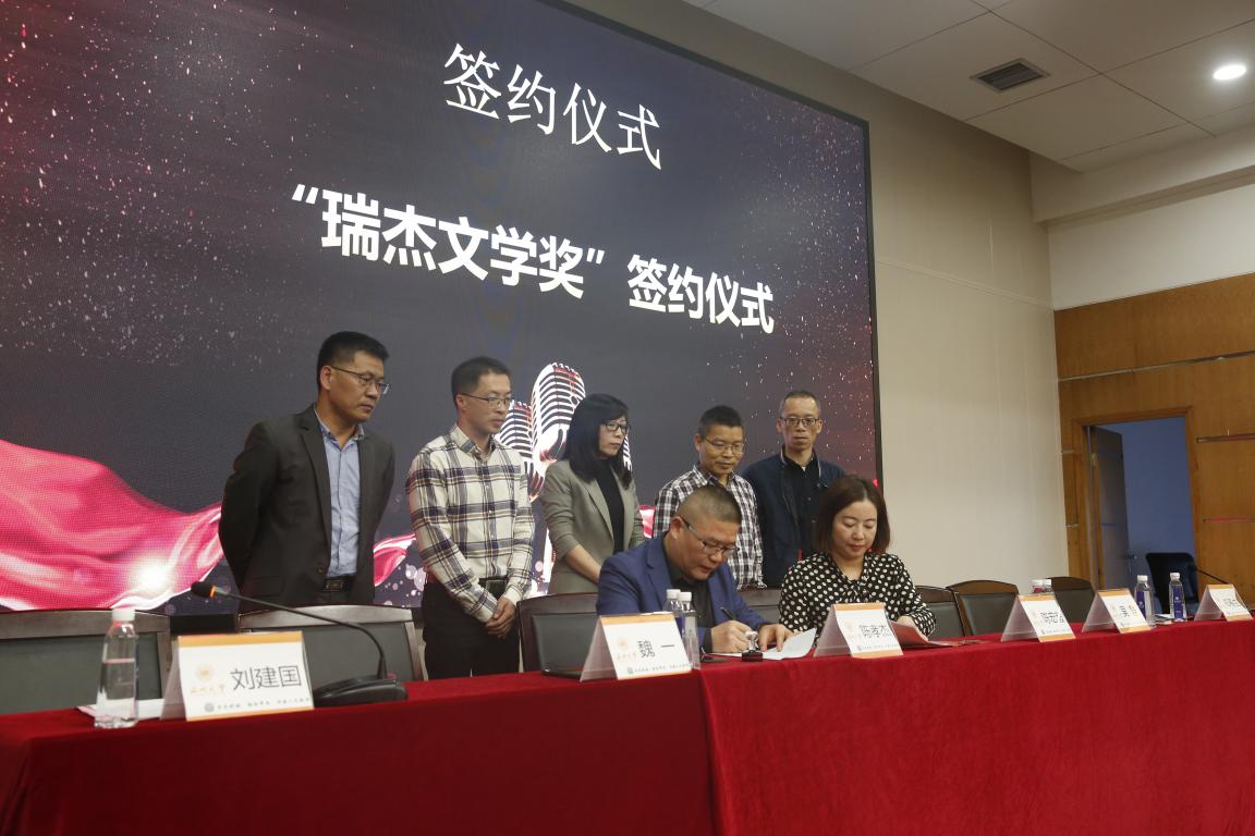 此次“瑞杰文学奖”是bat365在线中国官网登录入口历史系校友陈孝杰先生为支持bat365在线中国官网登录入口教育发展,鼓励bat365在线中国官网登录入口学生奋发向上,大胆追求自己的文学梦想,促进学生专业能力的发展,同时激发出众多文学爱好者们强烈的创作激情特捐资15万元设立“瑞杰文学奖”专项奖学金,用于奖励bat365在线中国官网登录入口具有文学特长学生,以及推动bat365在线中国官网登录入口学生文学创作发展所需的资金。仪式上温州万全教育集团董事长陈孝杰与校友办主任陈宏毅共同签署了合作协议。