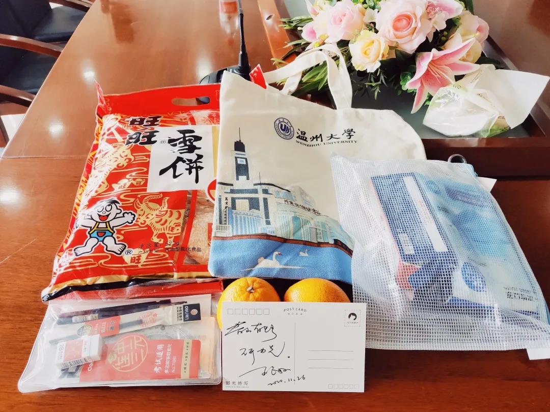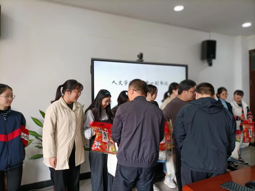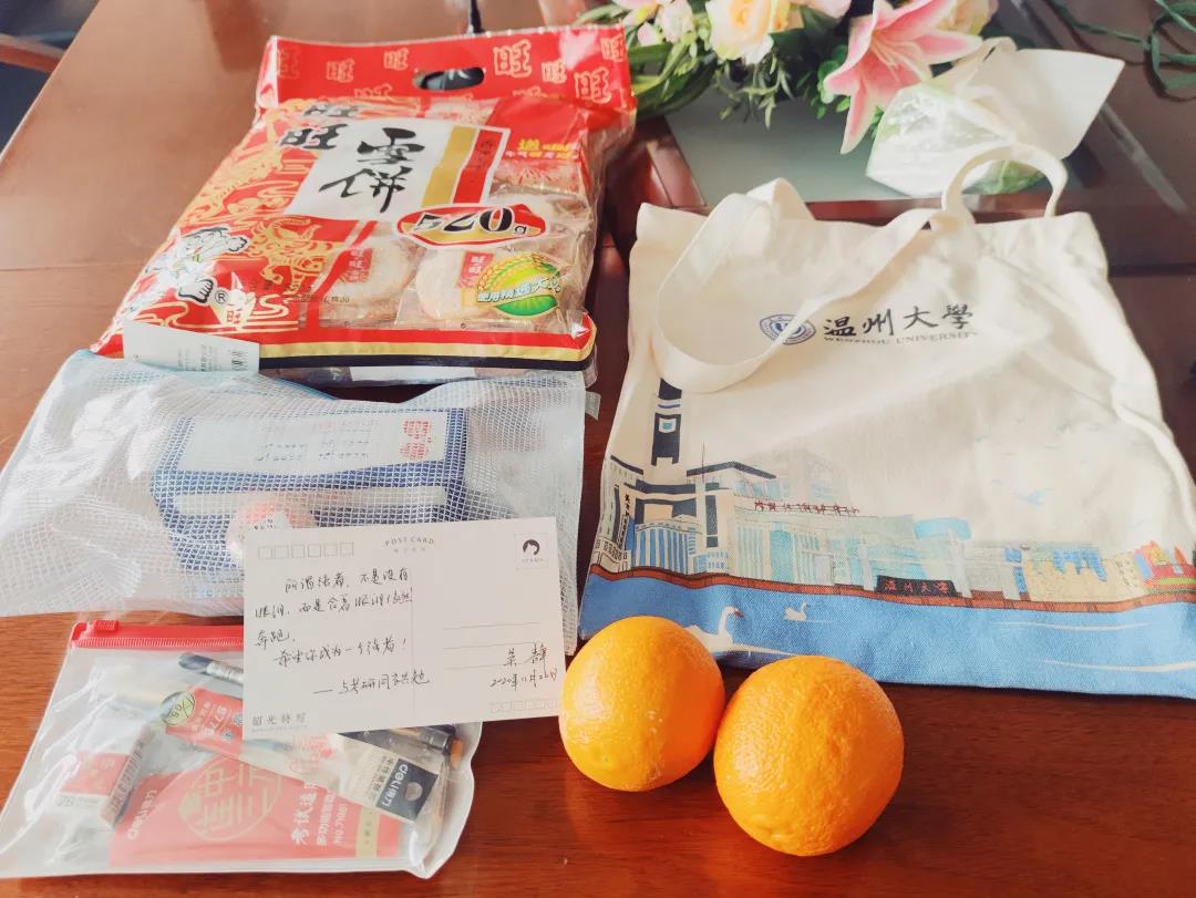除了老师们的关心,学院还为考研学子们准备了考研大礼包,礼包中有橙子、状元糕等各种“好彩头”,包含了老师们满满的祝福。考研学子们收到来自学院的礼物,很激动的说:“谢谢老师,谢谢来自学院的栽培和祝福,我们一定会在考研这条路上披荆斩棘,成功上岸,不负老师和学校的期望。”紧接着大家和老师们和了影,大家开心地露出了笑脸,师生之间气氛融洽。