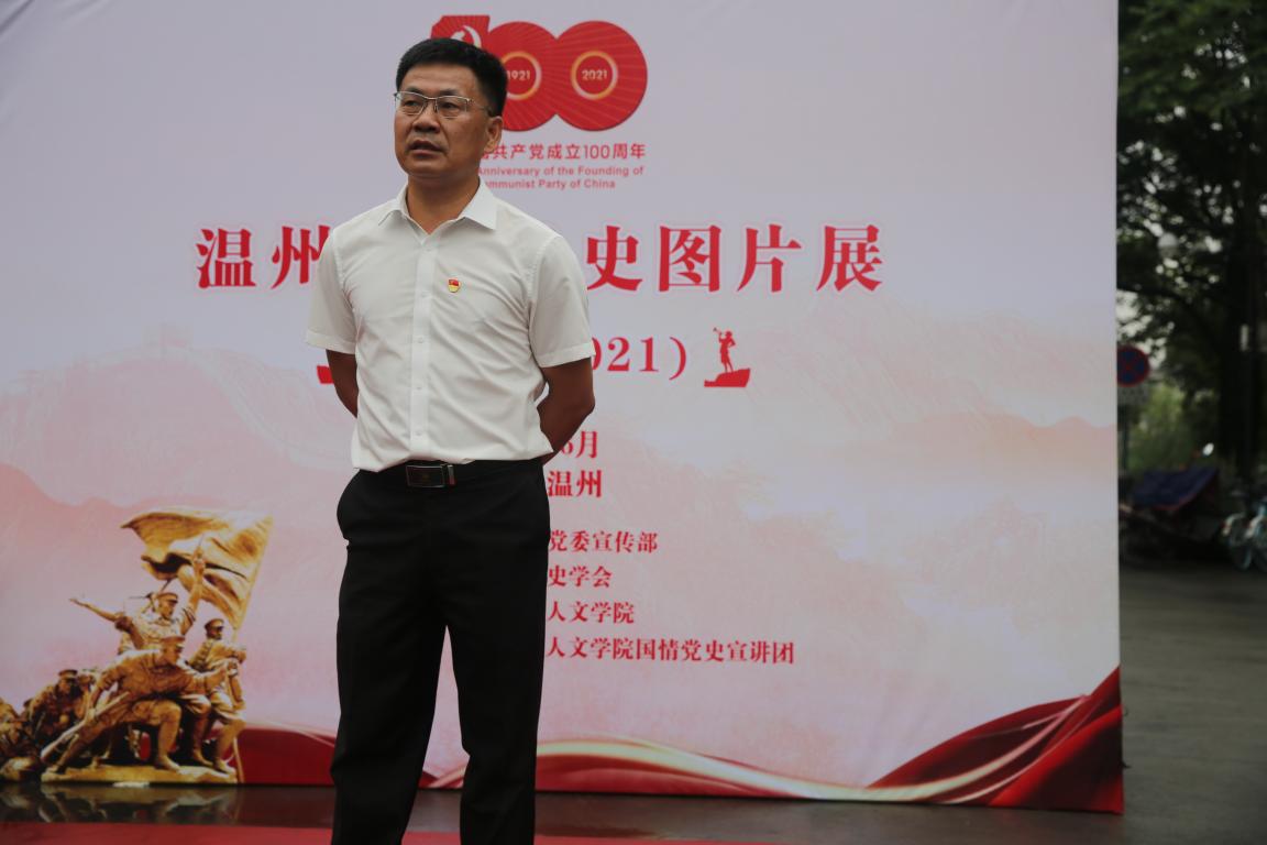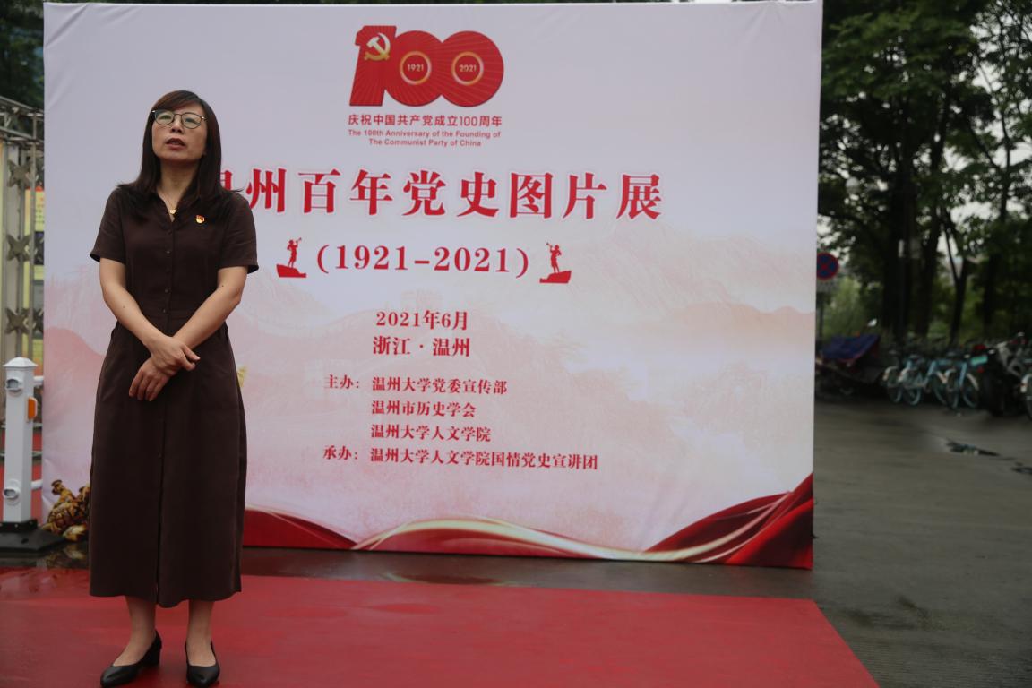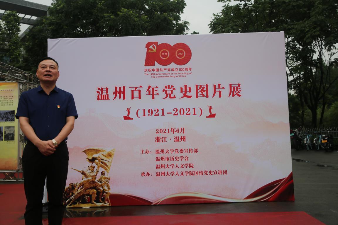 为庆祝中国共产党成立100周年,由bat365在线中国官网登录入口党委宣传部、温州市历史学会、bat365在线中国官网登录入口联合主办,bat365在线中国官网登录入口国情党史宣讲团承办的“温州百年党史图片展(1921-2021)”于6月22日在bat365在线中国官网登录入口育英图书馆前开幕。校党委委员、宣传部部长潘玉驹,bat365在线中国官网登录入口党委书记吴静、党委副书记魏一、历史系教授刘建国及师生党员代表等出席。