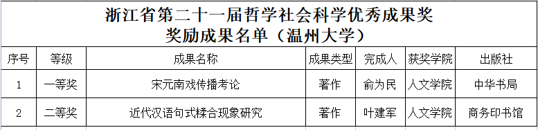 近日,浙江省第二十一届哲学社会科学优秀成果奖名单正式公布,我院共两项科研成果获第二十一届浙江省哲学社会科学优秀成果奖,其中俞为民教授的科研成果获一等奖,叶建军教授的成果获二等奖,获奖总数在我校所有院系中独占鳌头。具体获奖情况如下:
