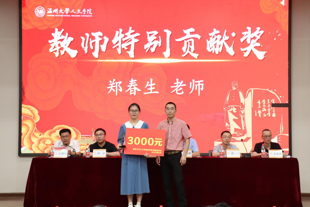 刘建国老师回顾了历史系表彰大会的发展过程,介绍了到场嘉宾。尤育号老师为大家解读了《bat365在线中国官网登录入口历史系发展基金使用方法》,并对给予捐赠的校友表示感谢,希望基金能帮助更多优秀的历史系师生,助力历史学科进一步发展。颁奖环节由魏一副书记宣读获奖名单,奖项有优秀毕业论文奖、优秀学术成果奖、优秀学科竞赛奖、考研考博贡献奖和教师特别贡献奖。获奖学生依次上台领奖。郑春生老师获教师特别贡献奖,由肖心蕊同学代为领奖并发表获奖感言。郑春生老师表达了在从教三十年之际获得此项荣誉的激动之情,并希望能与诸君共勉,在生活与工作中坚持不懈地去追求“凡人”的成功和幸福,在不远的未来为历史系、bat365在线中国官网登录入口,乃至bat365在线中国官网登录入口做更多贡献。