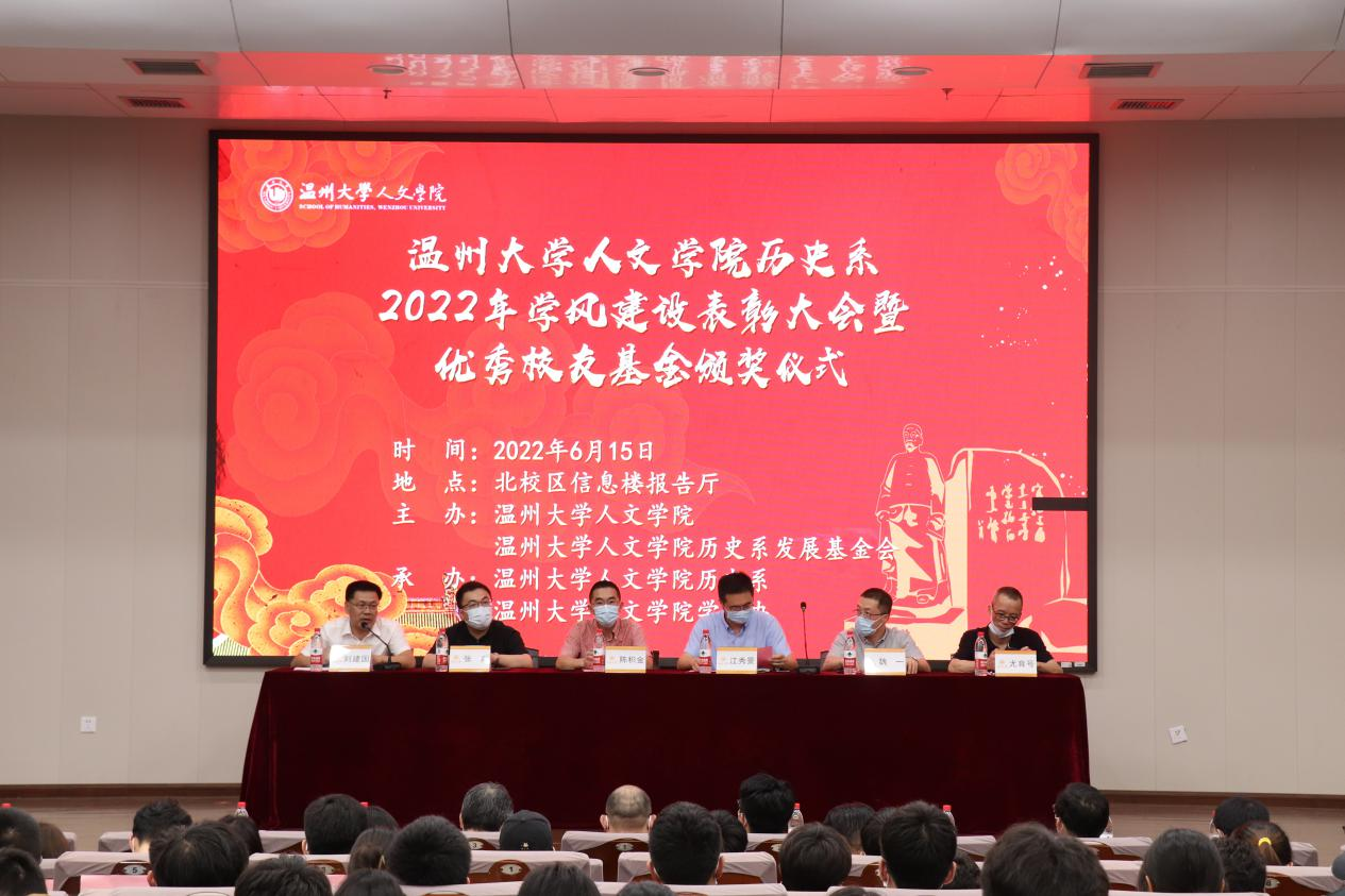 2022年6月15日,bat365官网历史系2022年学风建设表彰大会暨优秀校友基金颁奖仪式于北校区信息楼报告厅举行。大会由bat365官网历史系发展基金会会长刘建国主持,院党委书记江秀景、副书记魏一、张真老师、历史系主任尤育号、93政史校友陈积金以及历史系全体师生出席了此次会议。