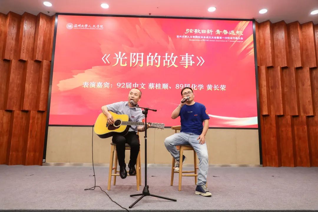 “遥远的路程昨日的梦以及远去的笑声,再次的见面我们又历经了多少的路程……”大会伊始,92届中文校友蔡桂顺、89届化学校友黄长荣携手吉他弹唱《光阴的故事》,瞬间点燃了现场气氛,也勾起了校友们的青春回忆。