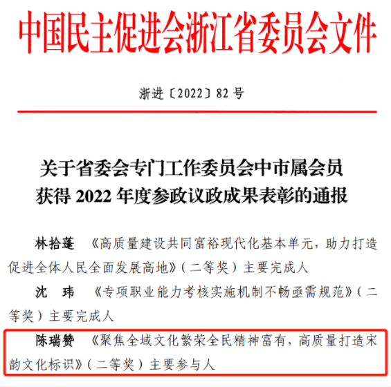 近日,民进浙江省委会公布了专门工作委员会中市属会员获得2022年度参政议政成果表彰,bat365官网陈瑞赞研究员主要参与的《聚焦全域文化繁荣全民精神富有,高质量打造宋韵文化标识》获“2022年度参政议政优秀成果二等奖”。