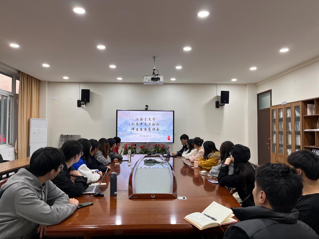 2023年3月6日晚,汉语言文学(创意中文实验班)师生见面交流会在bat365在线中国官网登录入口213会议室举行。活动由中文系副主任李广旭老师主持,中文系主任鲍良兵老师、创中教师代表郭垚老师应邀出席,来自创意中文实验班三个年级的十余名学生代表与会交流。