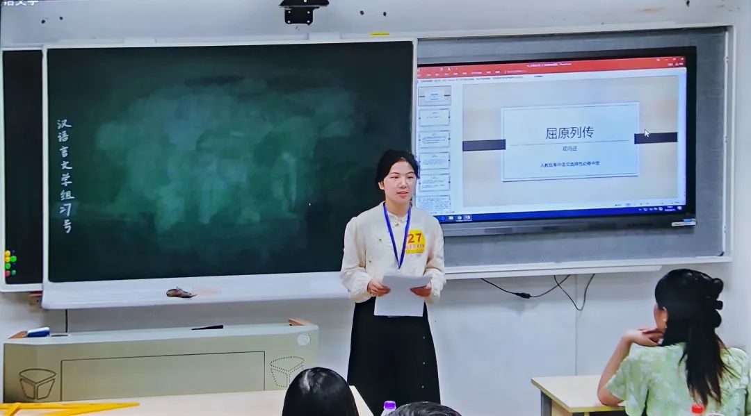 在比赛现场,孔佳妮同学自信从容、落落大方,展现出了作为一名温大优秀师范生的精神风貌。她抽到的课文是长篇文言文《屈原列传(节选)》。在授课过程中,她以课文第三自然段为支架,采用小组合作的方式——一人为朗读员,一人为讲解员,深入探究挖掘了文中屈原的形象及太史公对他的情感。孔佳妮同学通过多样的教学方法和细致深入的引导,很好地落实了“以学生为中心”的教育理念,将语文的工具性和人文性相统一,不仅激发了学生内心涌动的情感,更锻炼了他们的思维能力,课堂效果得到淋漓尽致的展现。