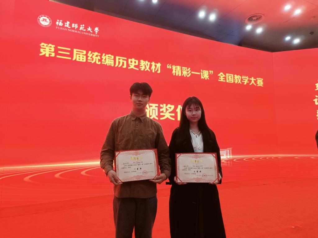 2023年4月14-17日,第三届统编历史教材“精彩一课”全国教学大赛在福建师范大学成功举办。我校参赛的20历本学生余浩楠荣获一等奖、梁列列获三等奖,尤育号老师获评“优秀指导教师”。
