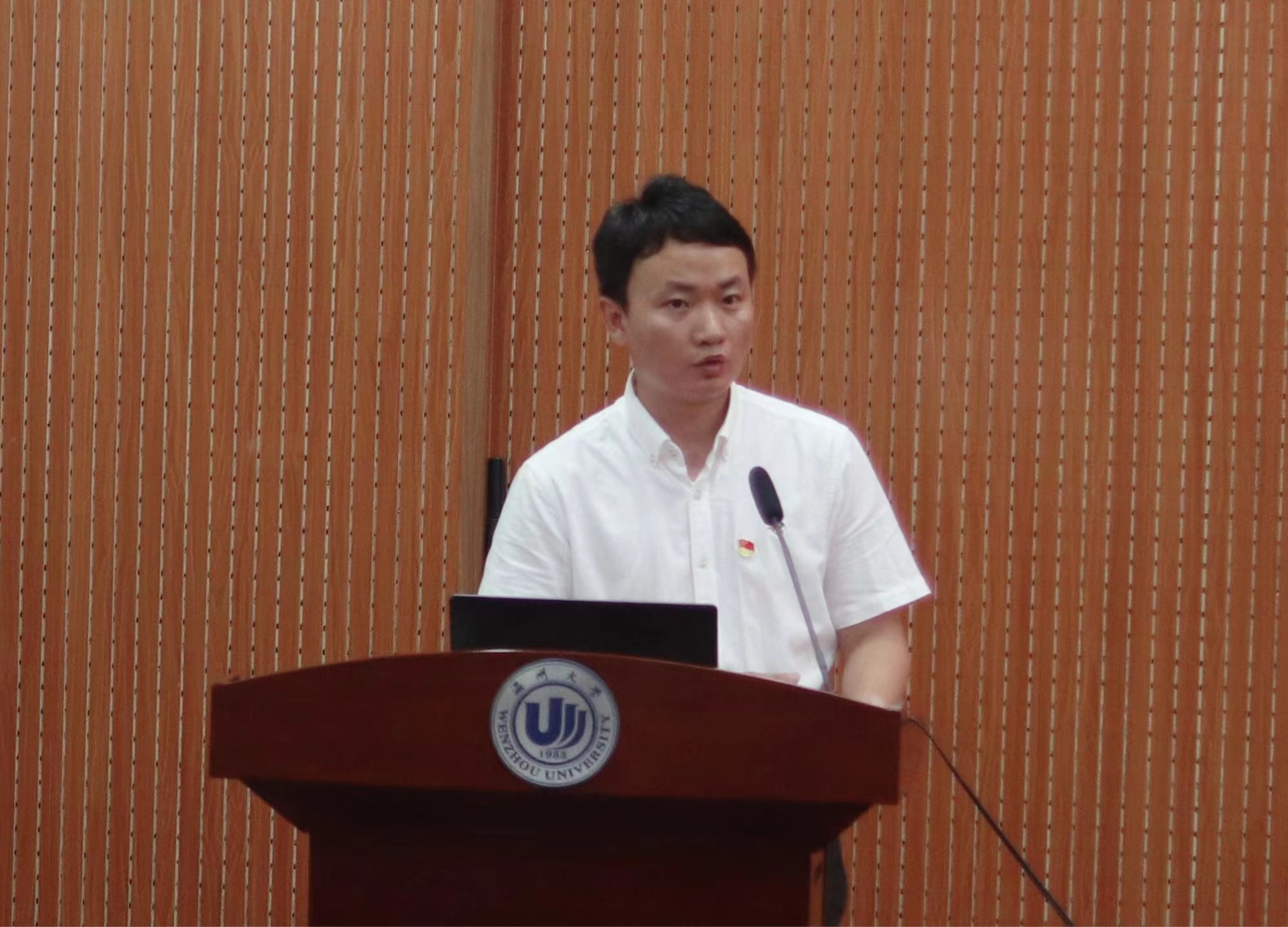接下来由三位学生代表依次发言。首先,21学科教学(语文)专业的研究生章溢琦作为优秀党员代表发言,作为青年党员,要强理论、筑信念;争创新、勇追梦;践初心、担责任;当先锋、争先行;学用结合、勇于担当,努力为学院的党建工作做出贡献。