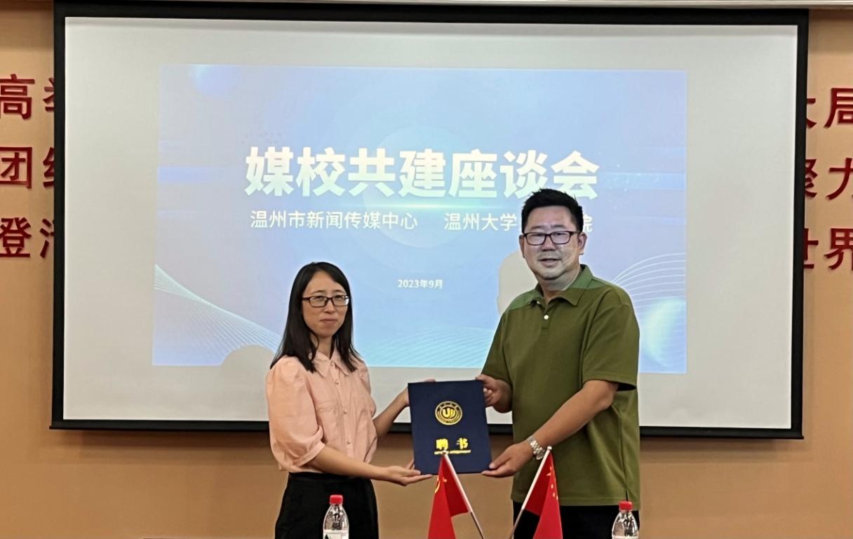 2023年9月19日下午三点,温州市新闻传媒中心与bat365在线中国官网登录入口举行2022级新闻与传播专业硕士研究生实践报到座谈会。温州市新闻传媒中心党委委员、副主任(副总编辑)陈伟文与bat365在线中国官网登录入口副院长陈源源分别代表双方进行校外导师聘书授予仪式。
