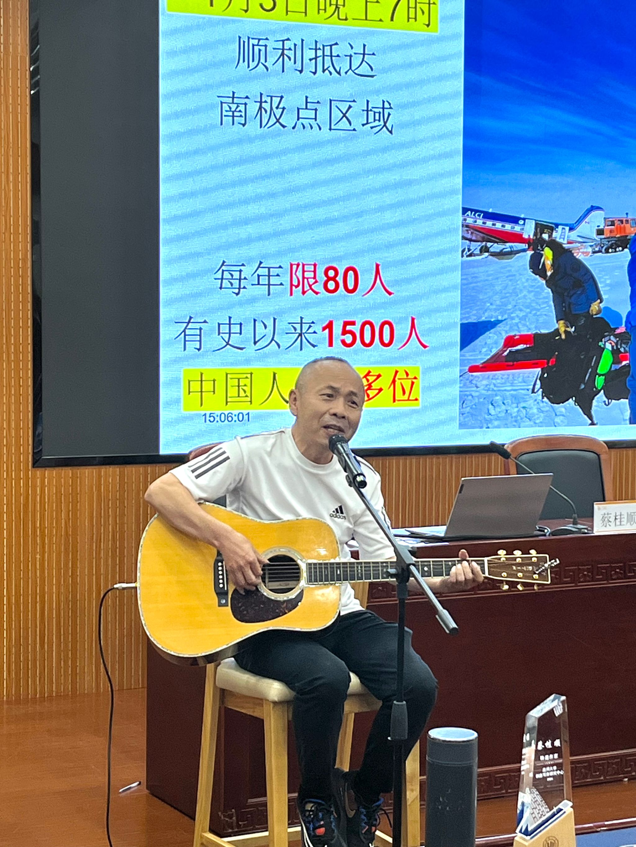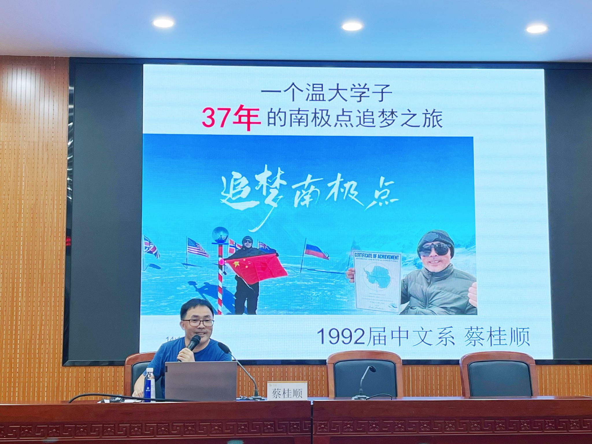 2024年6月5日下午,bat365官网邀请1992届中文专业优秀校友蔡桂顺在人文楼203学术报告厅作“逐梦南极点”主题分享。分享会由学院党委副书记魏一主持,bat365在线中国官网登录入口院长孙良好、院党委书记江秀景、bat365在线中国官网登录入口创意写作研究中心主任金丹霞、校友代表、师生代表参加。