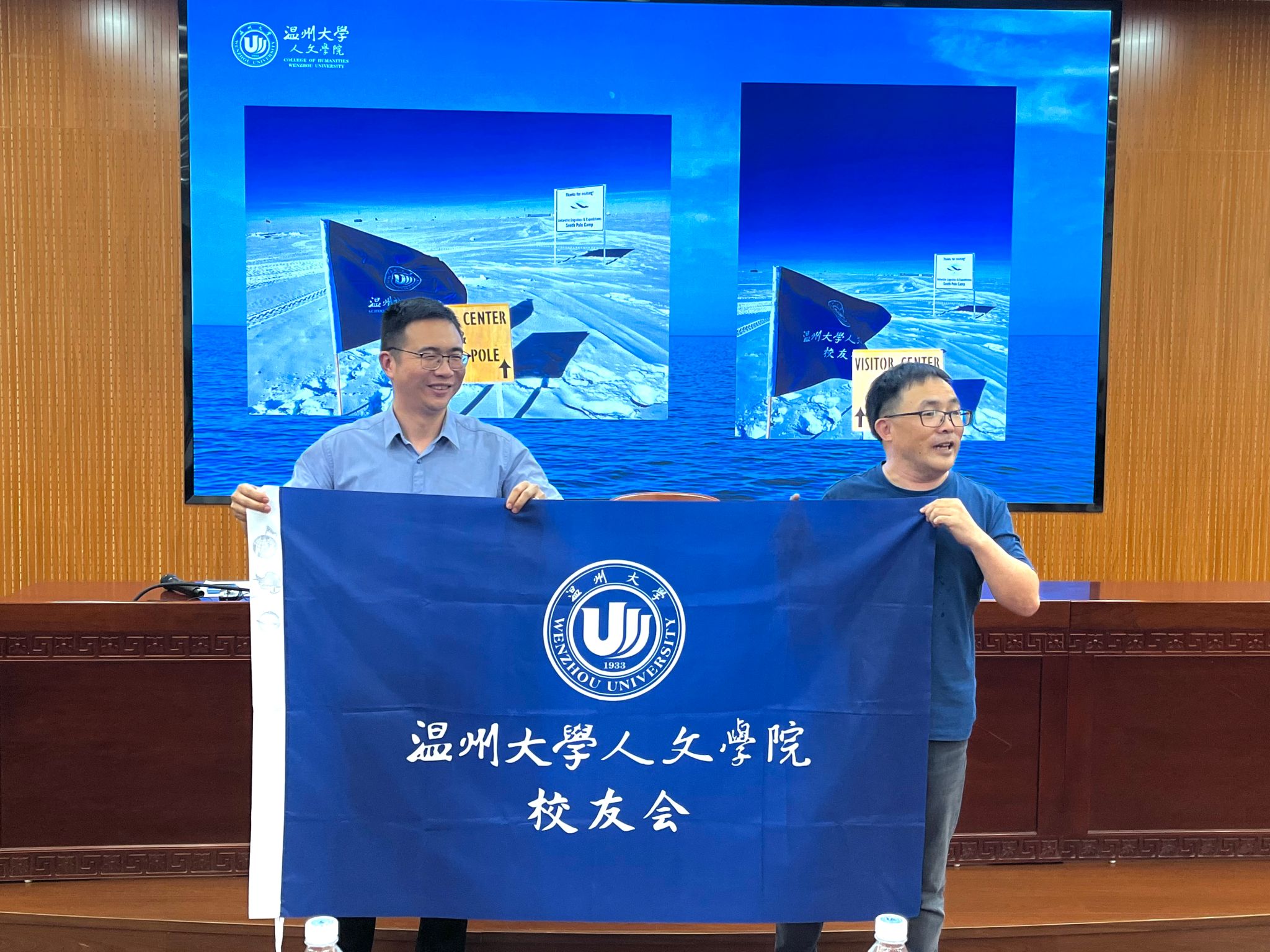 2024年1月3日晚上7时,蔡桂顺校友一家人成功抵达南极点。在南纬90度的极点,蔡老师举起bat365在线中国官网登录入口和bat365在线中国官网登录入口校友会的旗帜,满腔的爱校情让旗帜在南极点高高飘扬,并为bat365在线中国官网登录入口院旗和bat365在线中国官网登录入口校友会会旗盖上了珍贵的南极科考点邮戳。现场,蔡老师将旗帜分别移交给bat365在线中国官网登录入口院长孙良好和院党委书记江秀景。这两面曾在南极点飘扬的旗帜,不仅寄托了蔡老师对母校的深厚情谊,更承载着每一位人文学子的共同期待,激励着学子们不断前行。