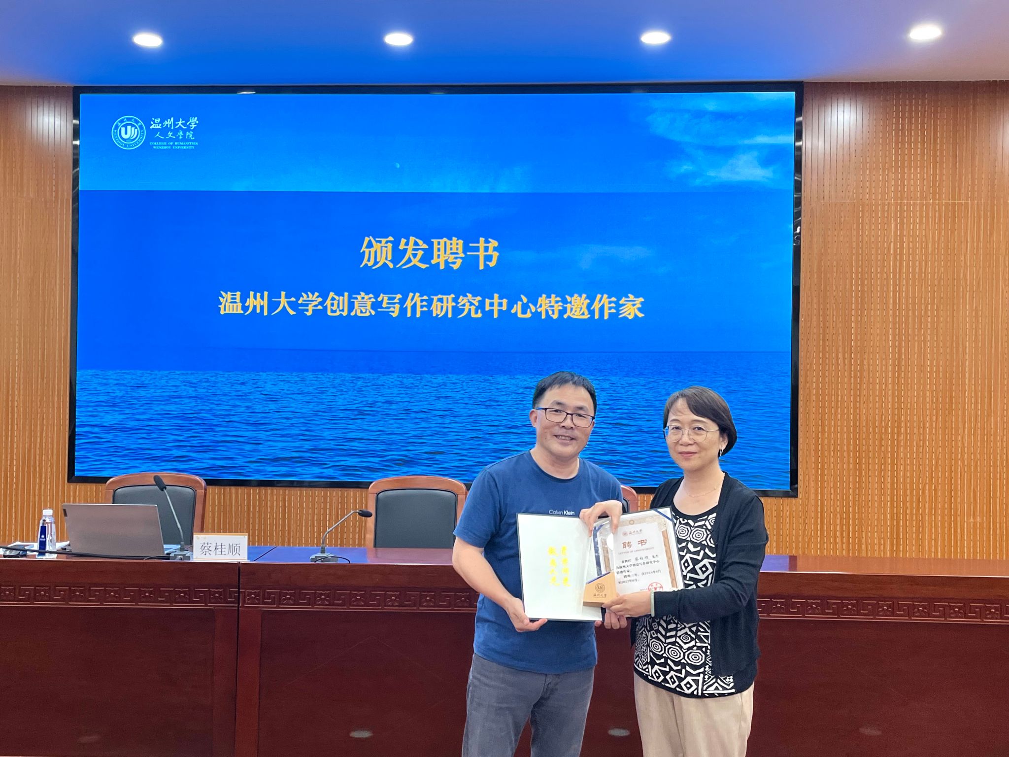 蔡桂顺校友是bat365在线中国官网登录入口校友会副会长、bat365在线中国官网登录入口“千年隼乡土文学奖”设立者、瑞安市政协委员。他从事教育及相关工作30年,在文学领域有着深厚的造诣,著有《上望往事》等系列代表作。分享会上,金丹霞教授为蔡桂顺颁发bat365在线中国官网登录入口创意写作研究中心特邀作家聘书。