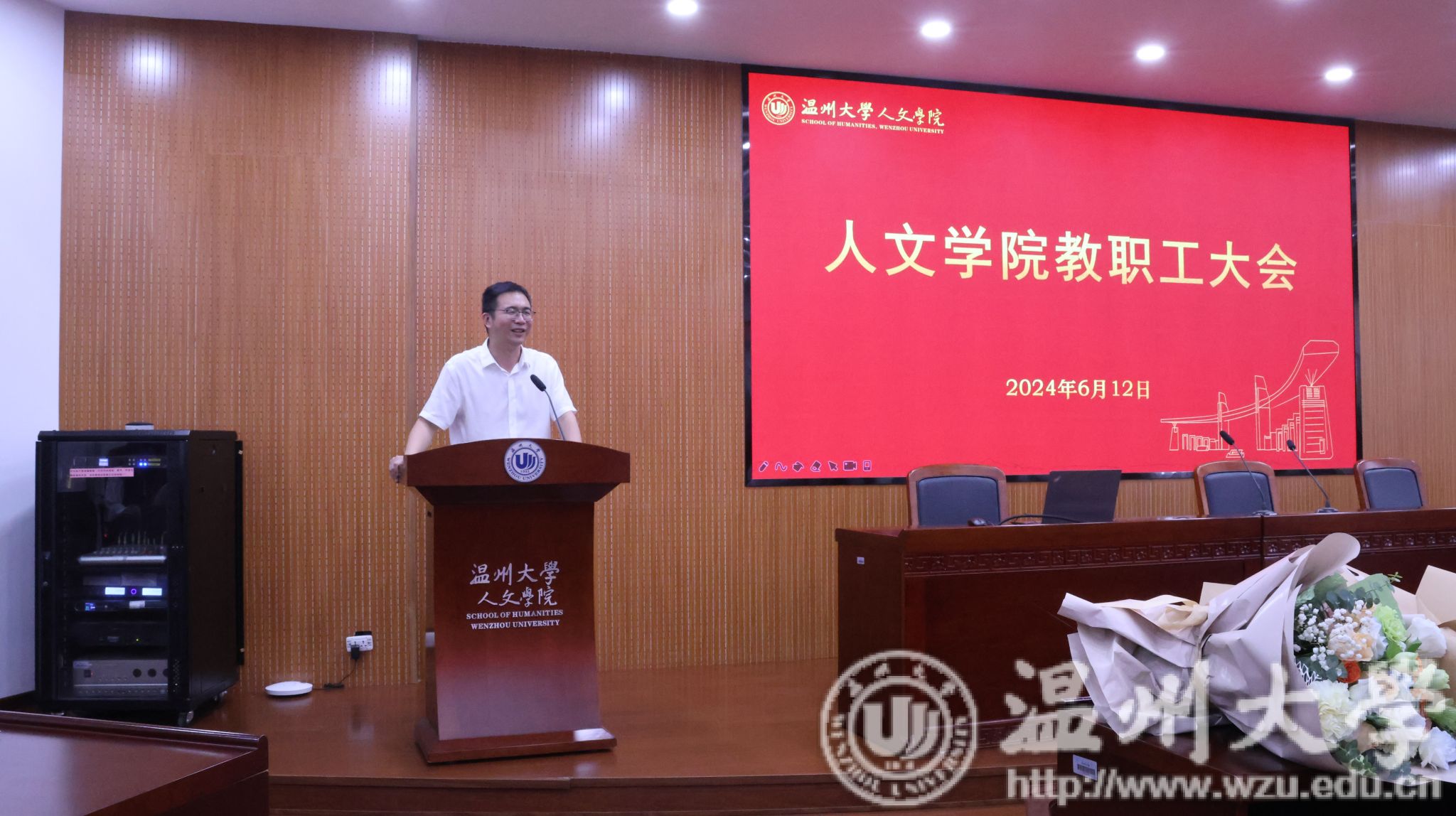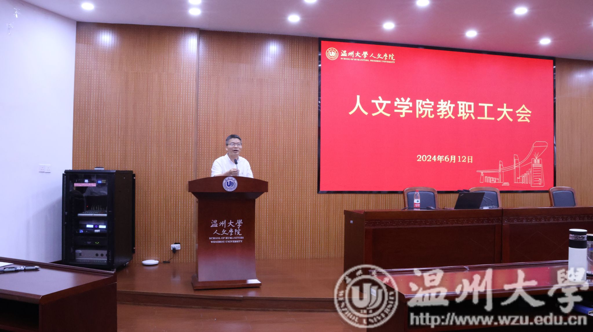6月12日下午,人文学院全体教职工大会在人文楼203报告厅召开。学院领导班子及全体教职工参加会议,会议由院党委书记江秀景同志主持。