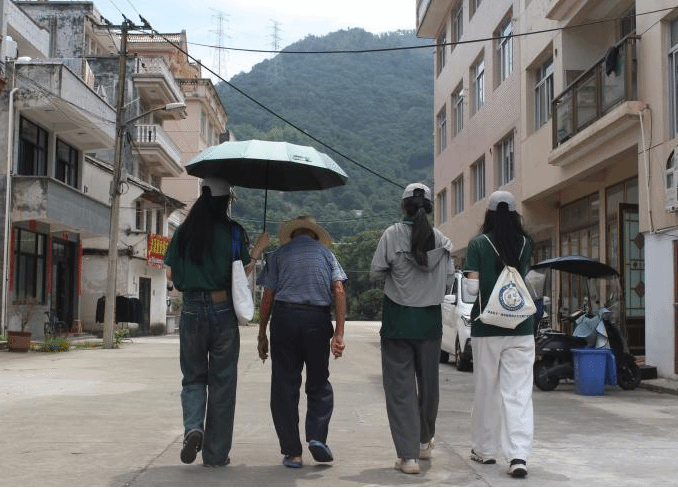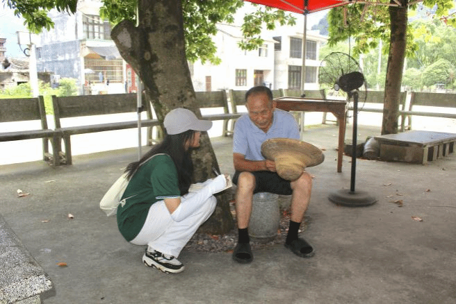 进入梅溪村,就看见一位脊背佝偻的老爷爷手指着宣传栏,阅读着里面的文字。队员与他聊天时,了解到他已95岁高龄,他用干枯爬满皱纹的手指指着包上的“推普助力乡村振兴”一字一顿地念给我们听,话带着浓烈的乡音。他在得知队员是来进行普通话调研后,热情地将队员们带去村民日常乘凉的地方。