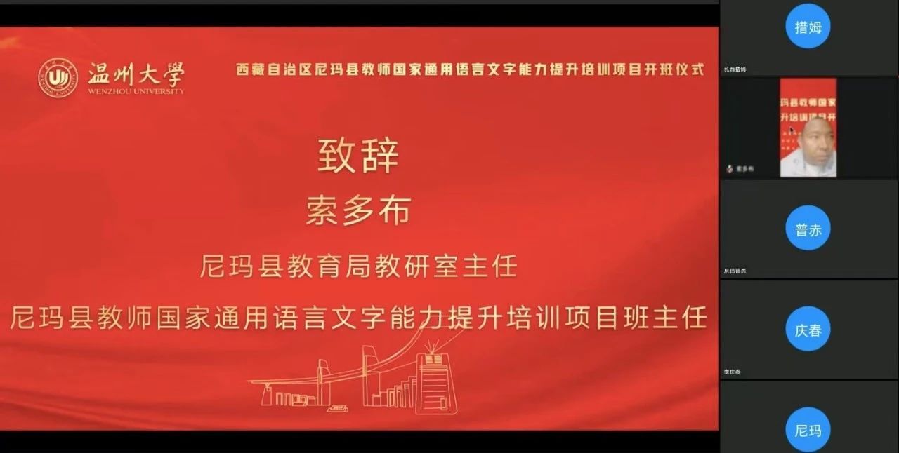 尼玛县教育局教研室主任、该培训项目班主任索多布老师在致辞中回顾了尼玛县推广国家通用语言文字的历程,强调掌握和运用好国家通用语言文字的重要性,并对参训学员提出具体要求,希望学员能够重视国家通用语言文字,提高学习积极性,高质量完成课程任务。